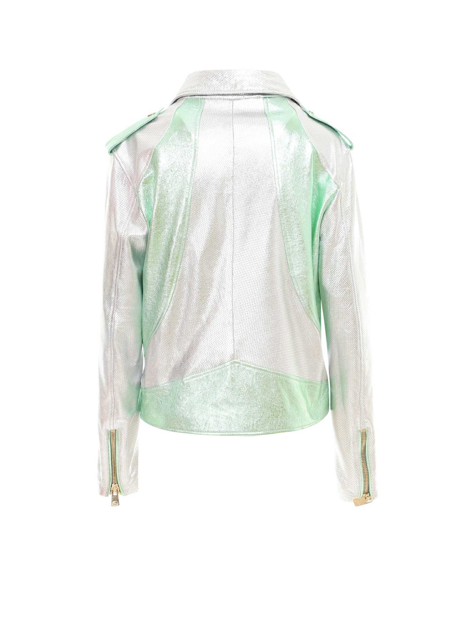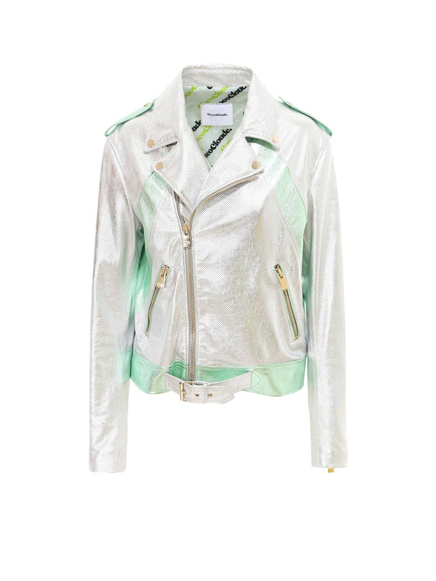 Get ready to shine in this stunning silver metallised leather jacket by COCO CLOUDE. Crafted from 100% leather with perforated detailing, this jacket features a zip closure and front pockets with leather strap and metal buckle. The lining is made from 97% recycled polyester and 3% elastane for added comfort. Available in a range of sizes, this jacket is perfect for any fashion-forward woman looking to make a statement in style.