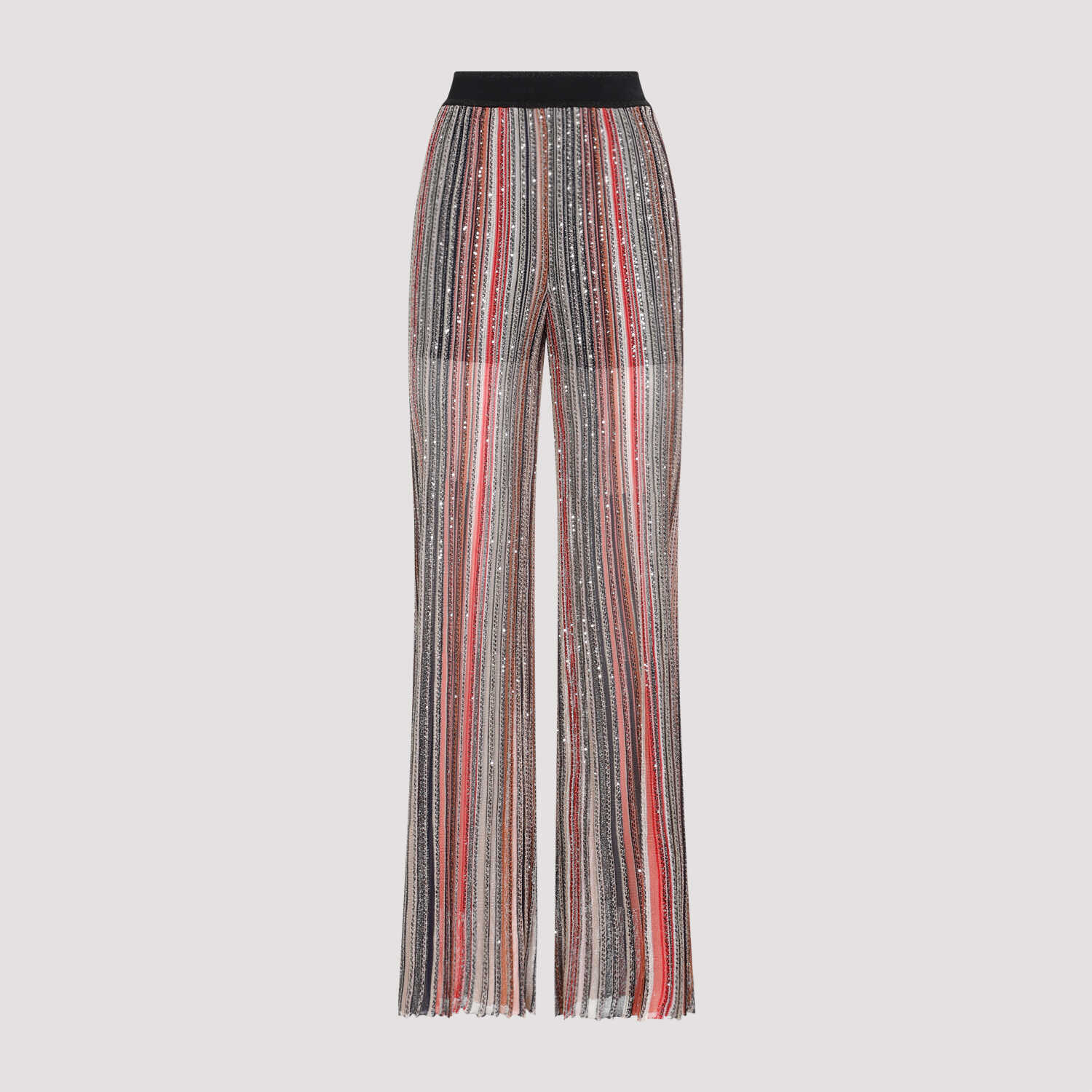 Missoni Multi Black Rust Viscose Pants. Crafted in semi-transparent viscose blend, vertical multicolor, black and rust stripes adorned with sequins, black elasticated waistband with lurex details, wide legs, pleated and straight hem. Partially lined.