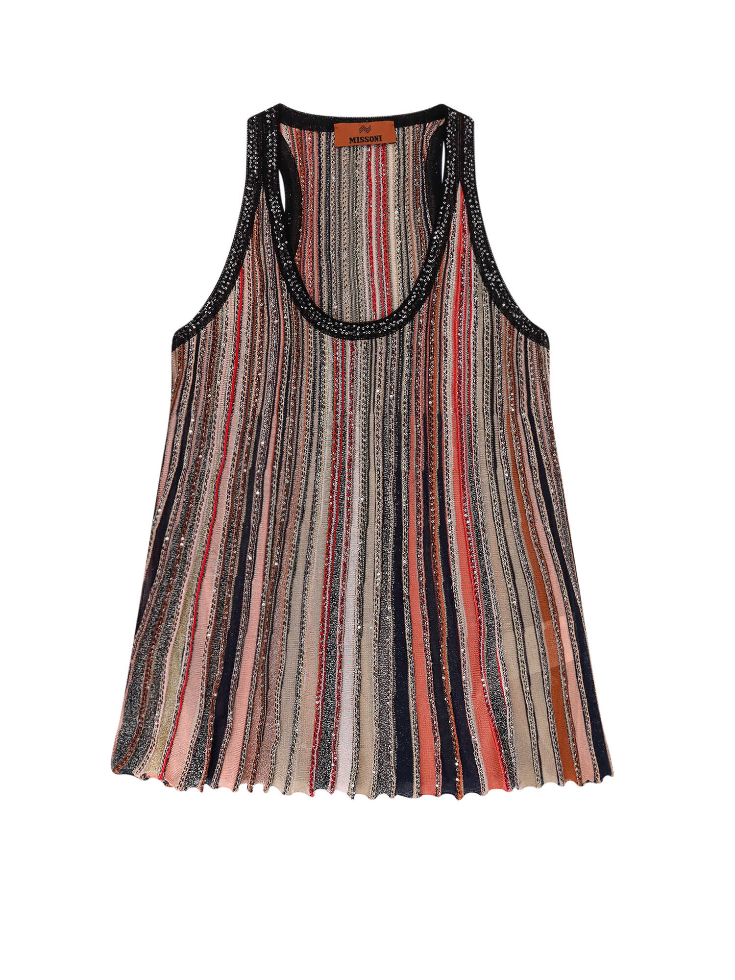Rounded neckline with ribbed black profile, Multicolor stripes with sequins embroidery, Flared bottom, Made in Italy, 55% viscosa 25% polyamide 15% polyester 5% metallised
