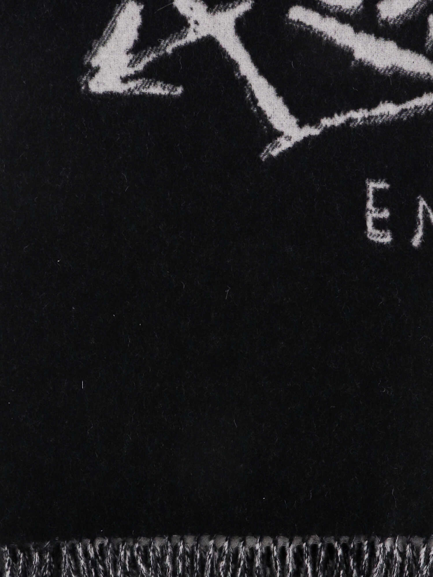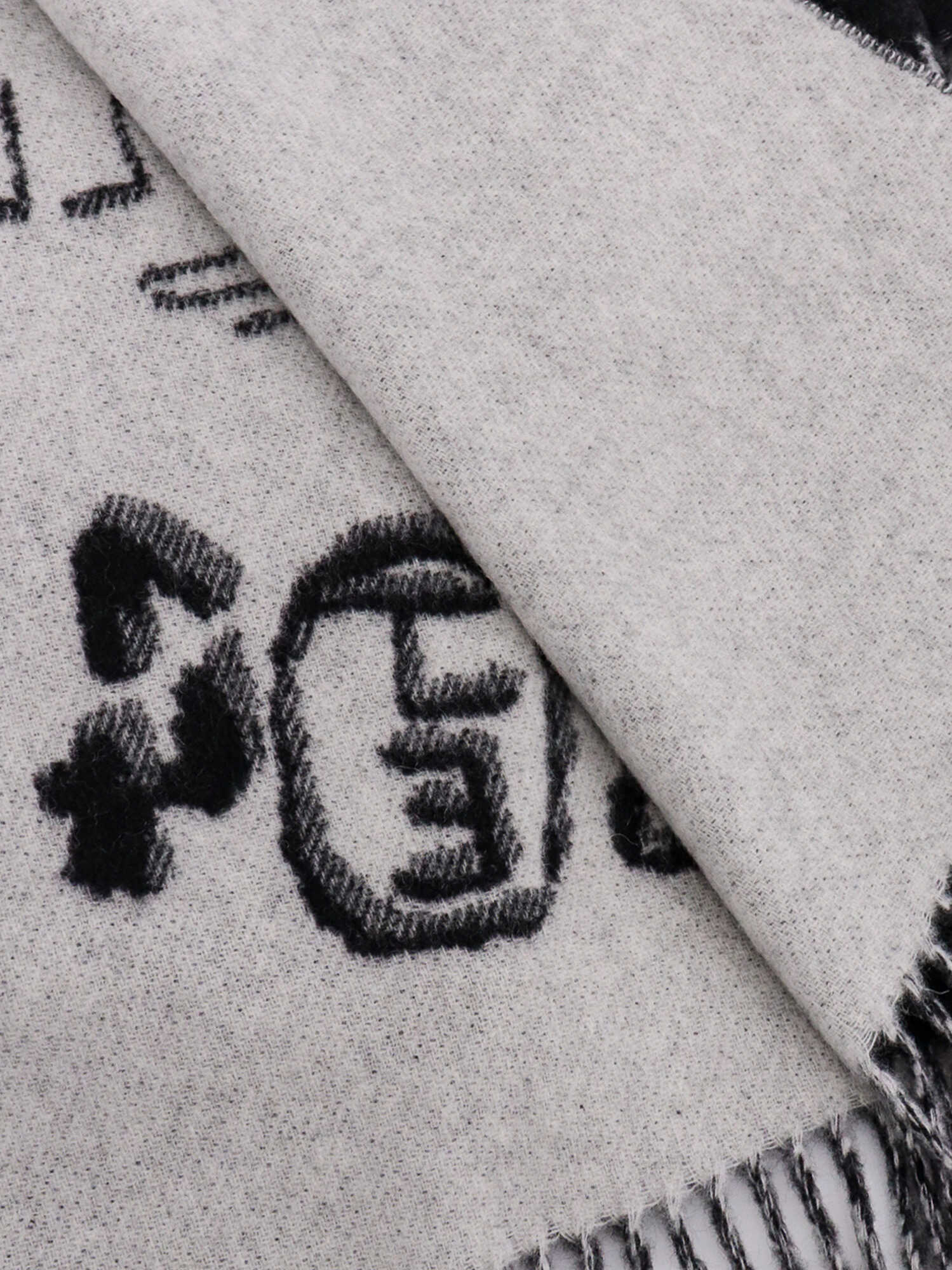 All-over Graffiti print, Frayed profiles, 72 x 30, made in Italy, 80% wool 20% nylon