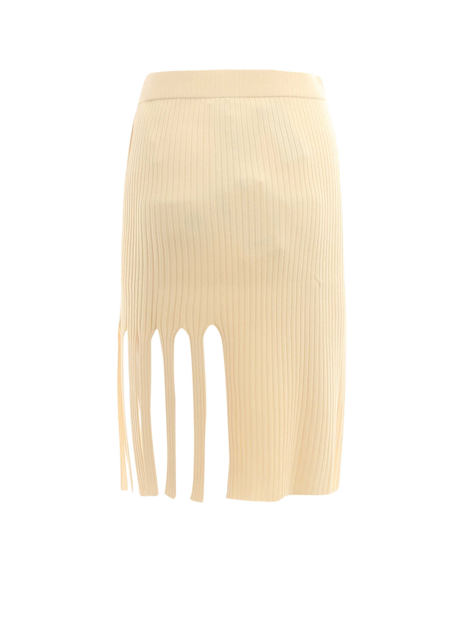 Get ready to turn heads in this gorgeous yellow ribbed knit skirt from K KRIZIA. The elastic waistband and bottom fringes offer a comfortable fit, while the stitching profiles add a touch of elegance. Unlined, it features a material blend of 75.8% acetate and 24.2% polyamide. Perfect for any occasion, this skirt falls under Women's Clothing > Skirts category. Order now and experience fashion like never before!