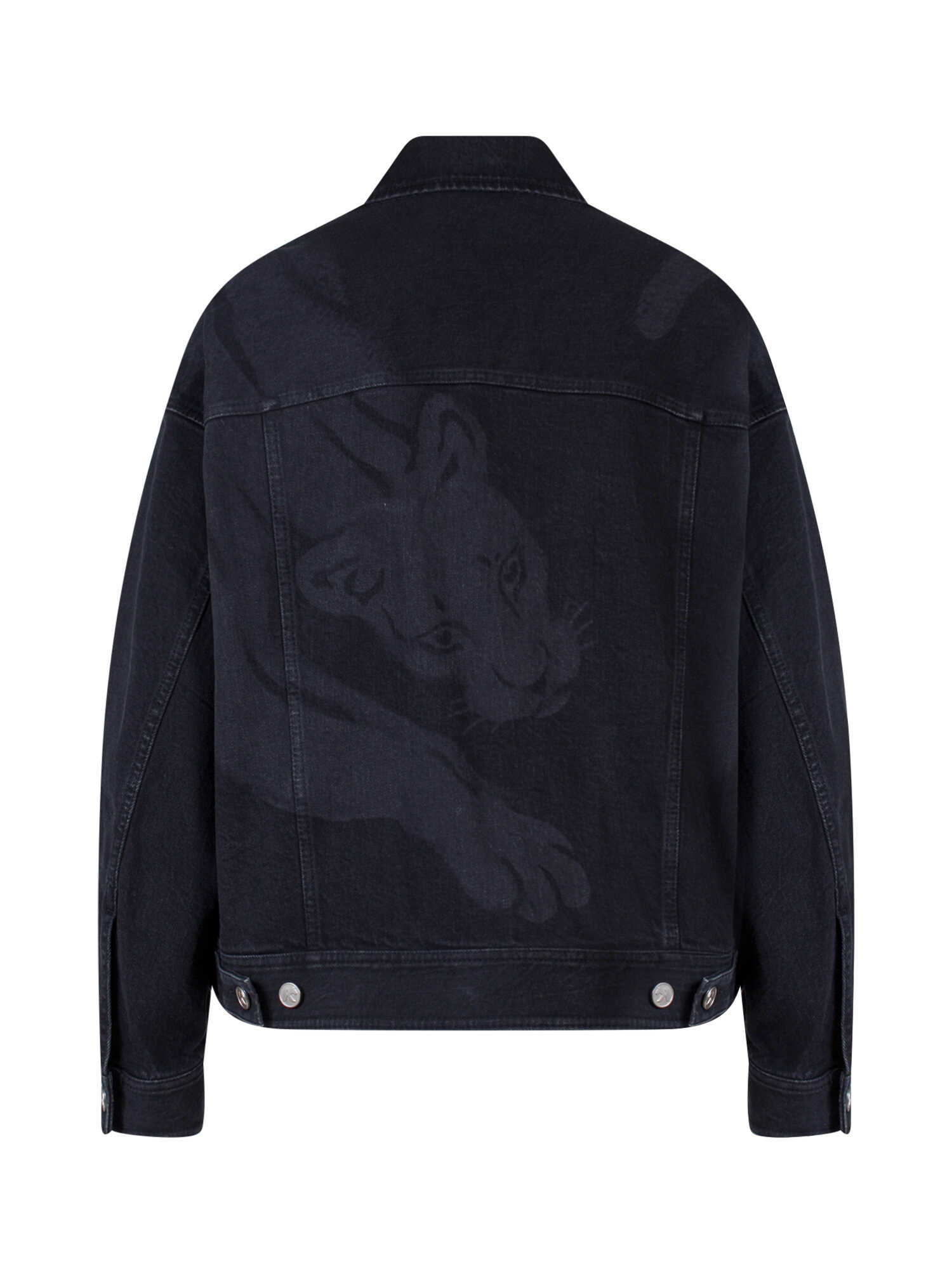 Make a statement with this black denim jacket from K KRIZIA. Featuring a unique and iconic print on the back, this jacket is perfect for any occasion. It has a comfortable fit with balloon long sleeves and front pockets with flap and button. The closure is made with logoed metal buttons and the material is 99% cotton and 1% elastane. Available in IT size range and custom tariff 6204620000. Don't miss out on this must-have addition to your wardrobe!