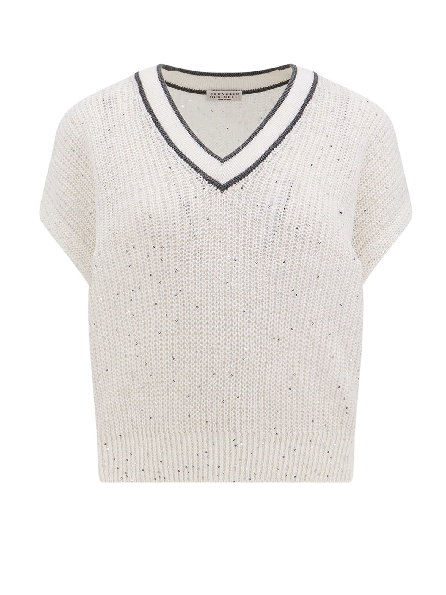 V-neckline, Sleeveless, Contrasting profiles, Made in Italy, 96% linen 4% nylon