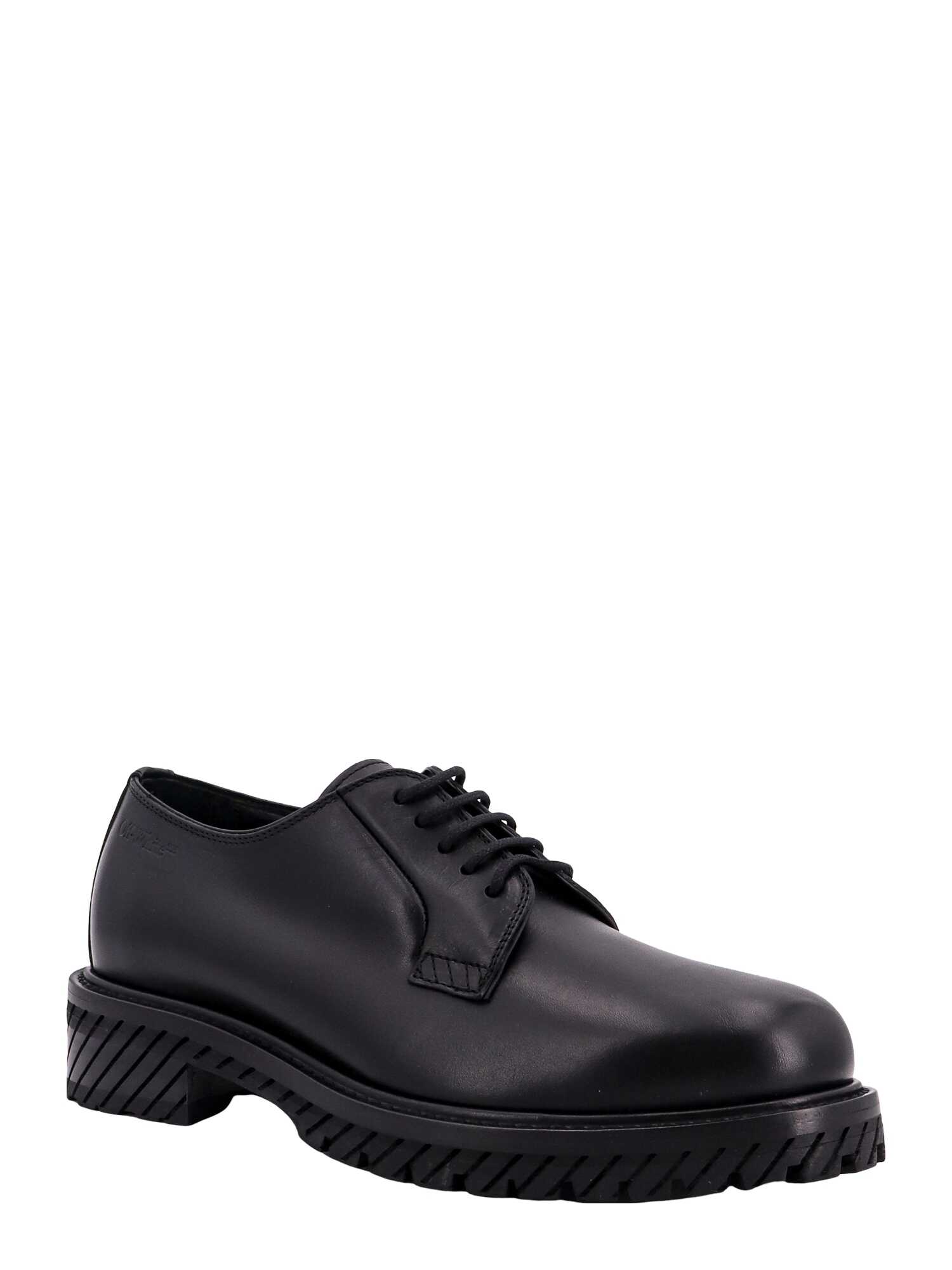 Step up your style game with these black Derby leather shoes by OFF WHITE. Featuring a lace-up closure, rounded toe, and rubber lug sole, these shoes are made in Italy with high-quality leather. The engraved logo adds a touch of sophistication. With a comfortable rubber sole and a sleek design, these shoes are perfect for any occasion. Get ready to make a statement with these stylish and trendy shoes!