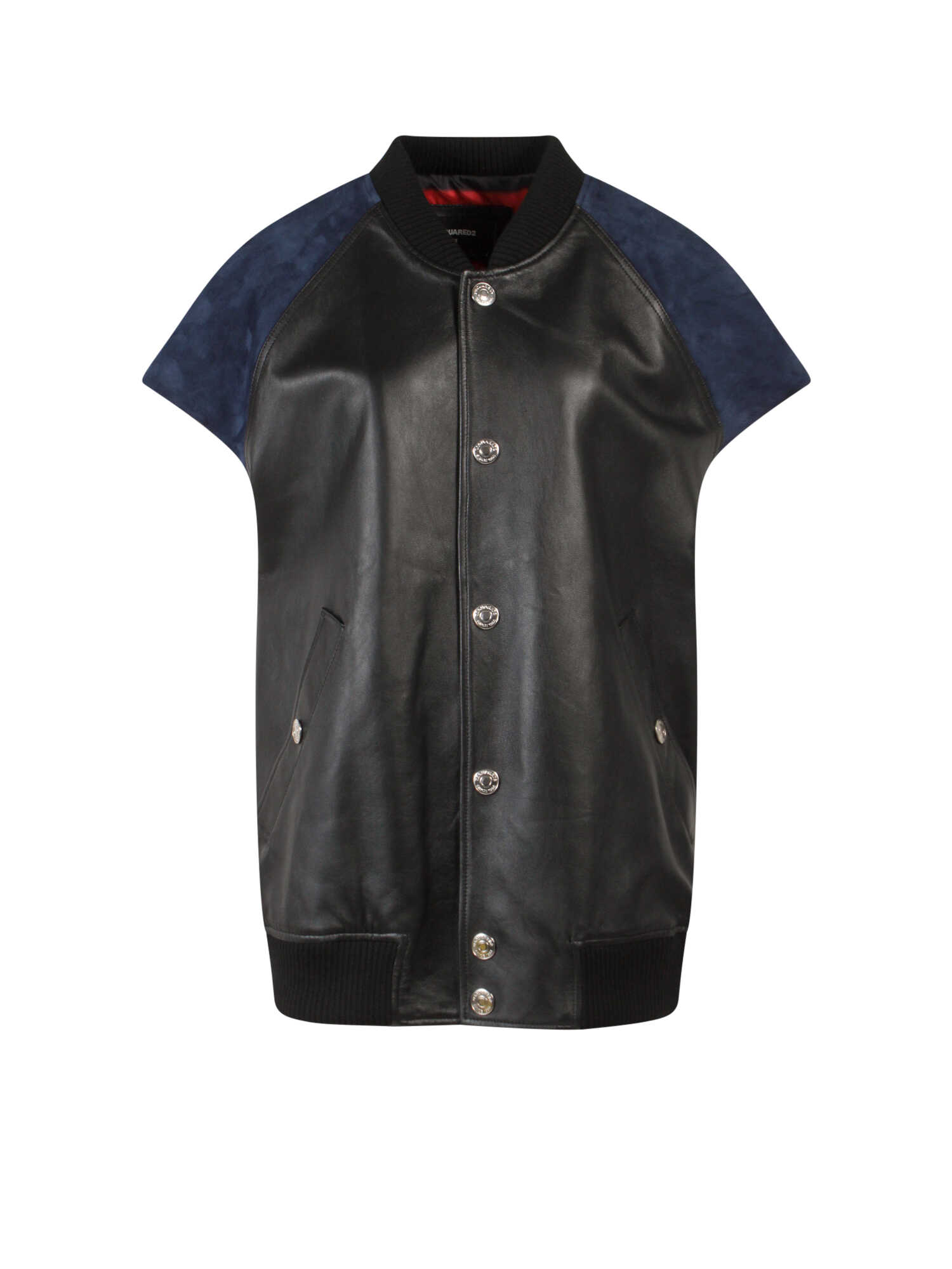 Step up your fashion game with this stunning leather sleeveless oversize jacket from DSQUARED2. The jacket features a black color, colored suede inserts, and a closure with maxi metal buttons. It is made in Italy using 100% leather and has a lining of 100% polyester. The jacket has pockets with buttons on the front, making it both stylish and functional. Perfect for women in search of a chic and comfortable jacket, this is a must-have item for your wardrobe. Get yours now and make heads turn wherever you go!