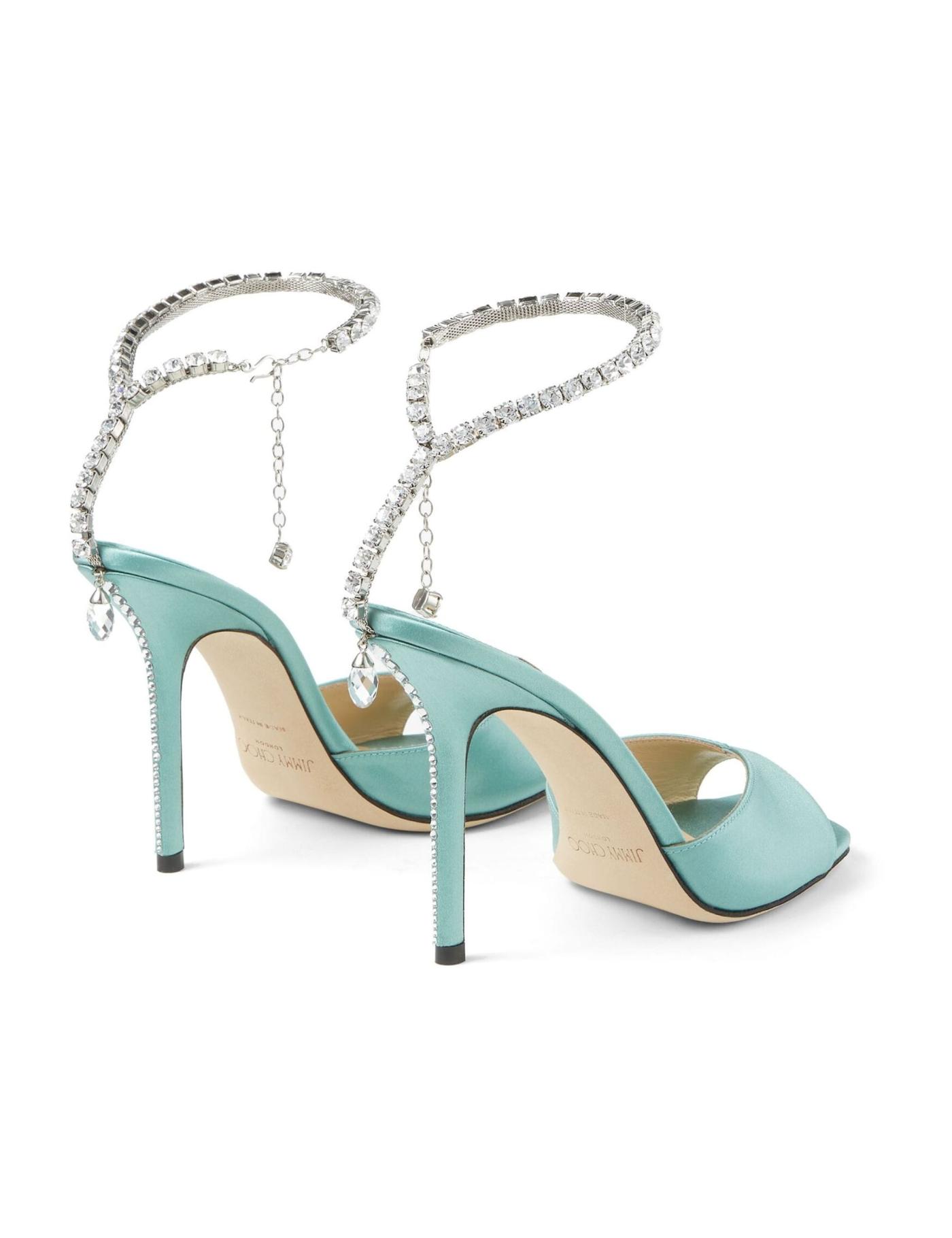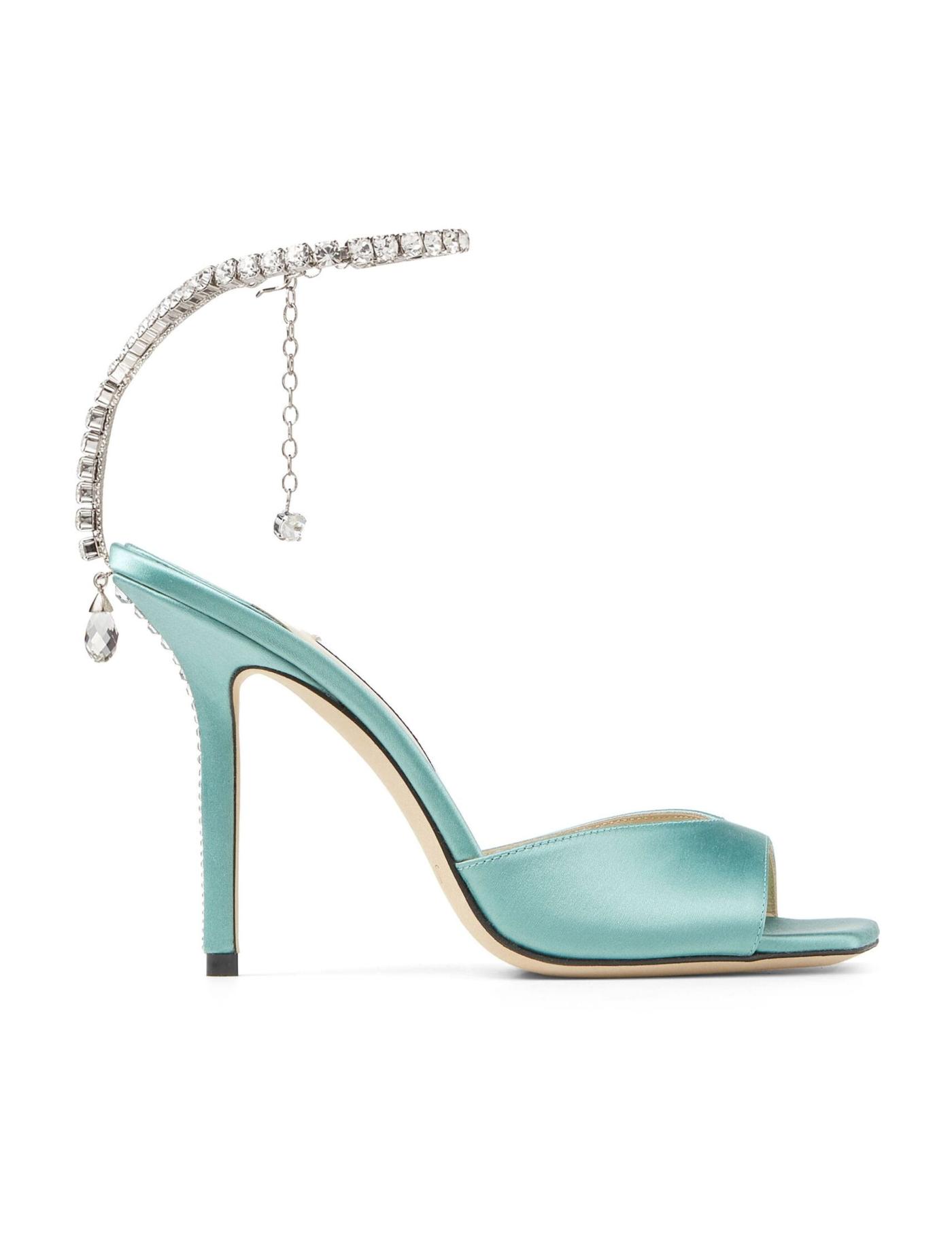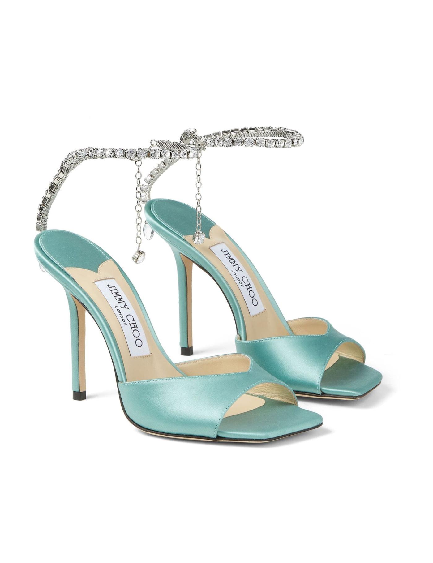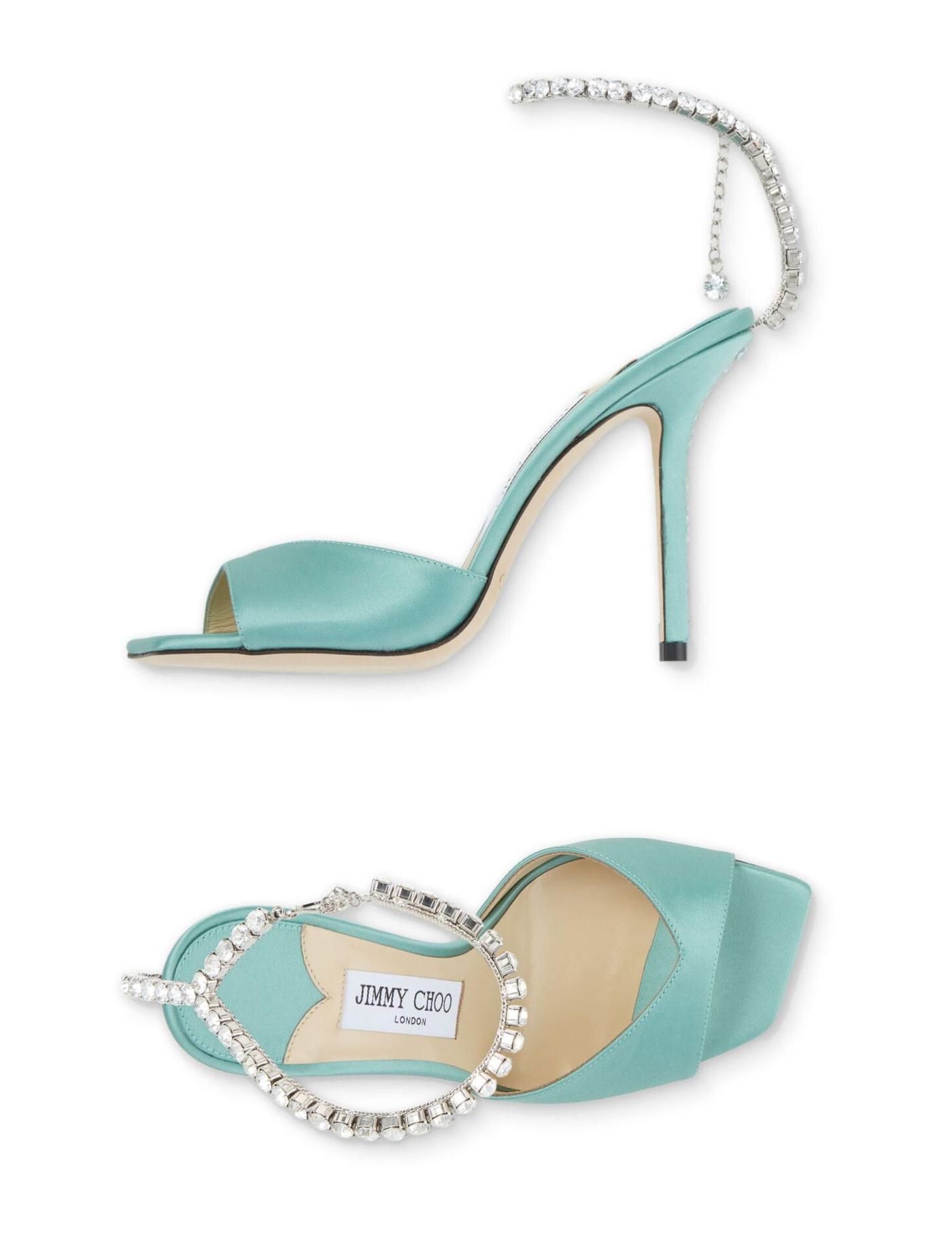 Incorporating details usually seen in jewellery, the Saeda pumps are crafted in Italy in a deep turquoise green hue. The pair is decorated with crystals all over the pointed toe and a delicate crystal chain adorns the ankle.