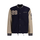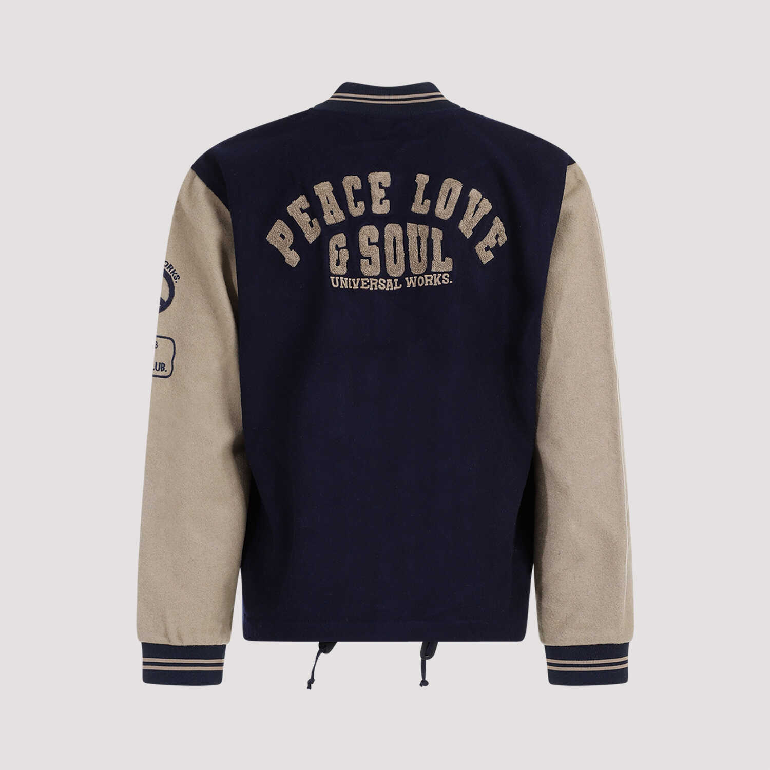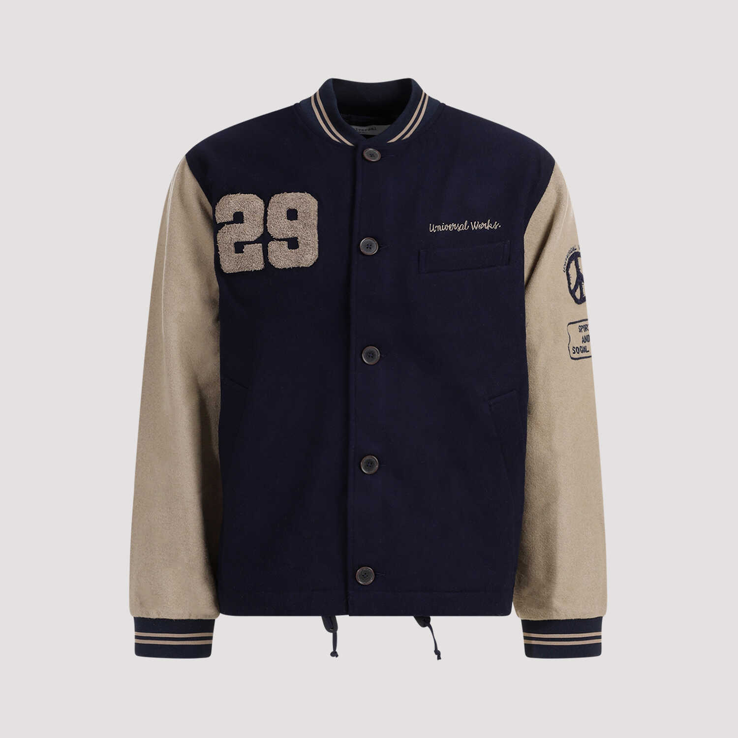 Universal Works Blue Navy Wool Newark Bomber. Crafted in wool and polyamide blend. Stand-up ribbed blue and sand collar, front buttoned fastening, two front slit pockets, one slit pocket on the chest, front embroidered sand logo on the chest, 29 sand fluffy patch, back sand lettering logo, long sand sleeves, blue logo embroidered on the left sleeve. White and blue ribbed cuffs, ribbed adjustable hem, straight hem.