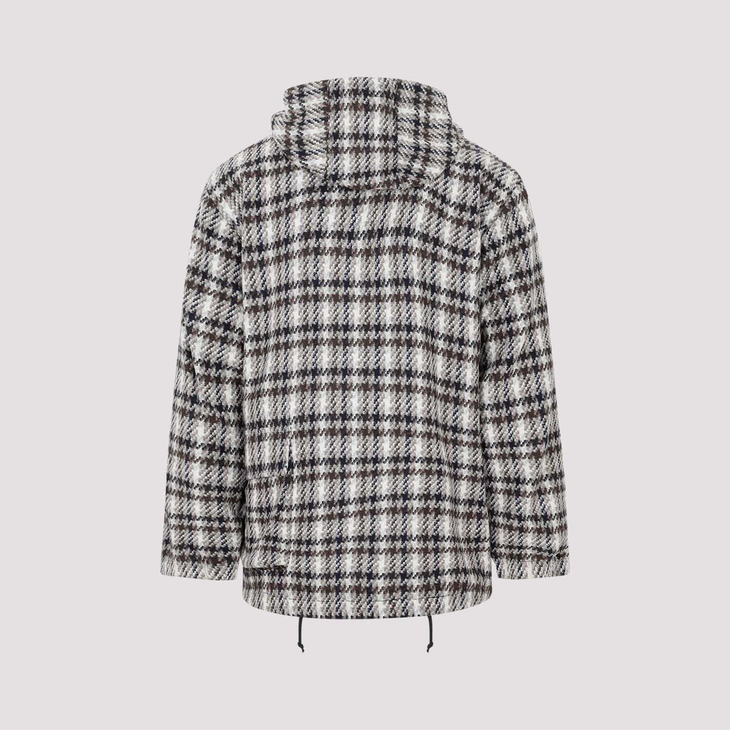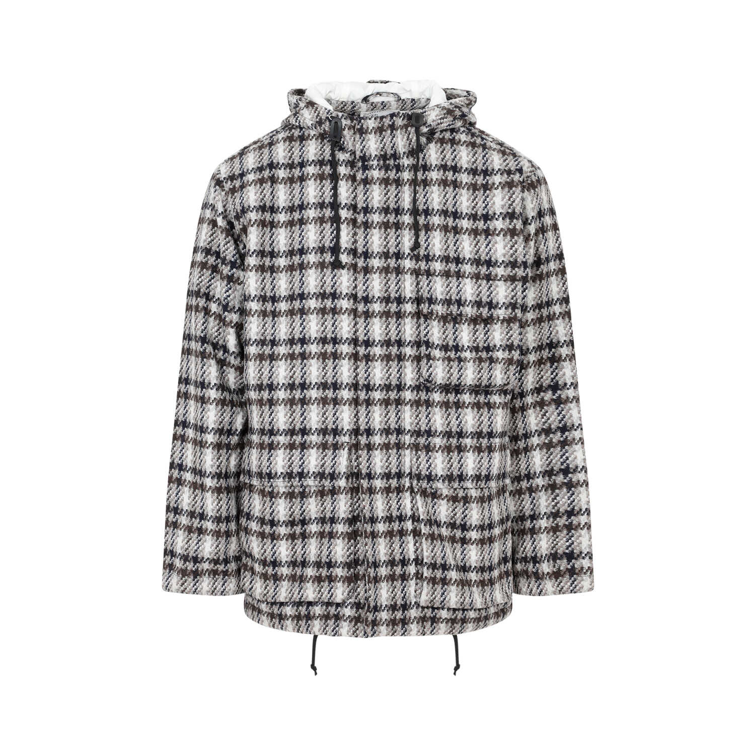 Universal Works Grey Wool Stayout Jacket. Stand-up collar, adjustable hood, concealing zipped fastening on the front, front flap pockets and side flap pocket, checked pattern all-over, long sleeves, adjustable hem.