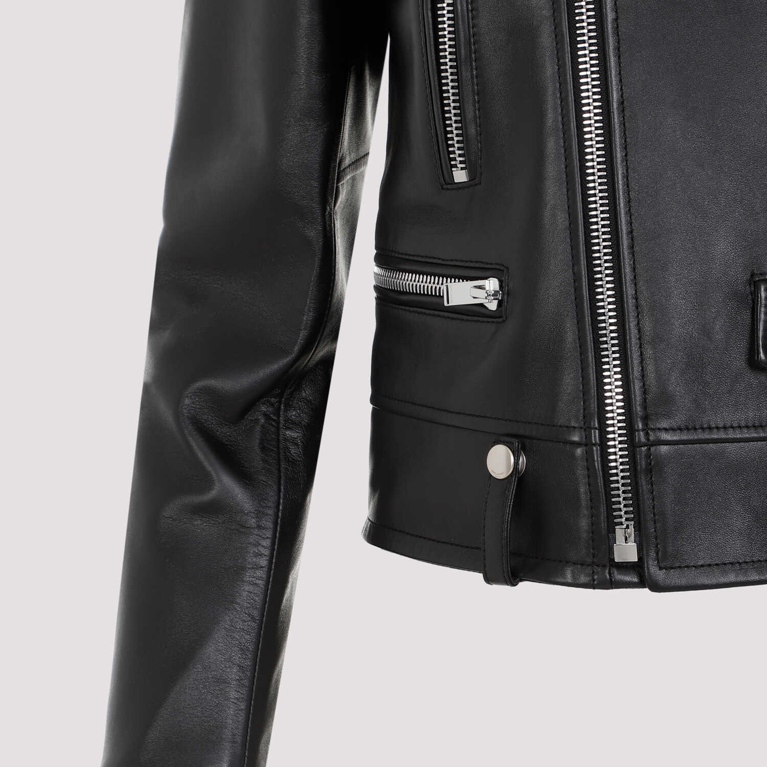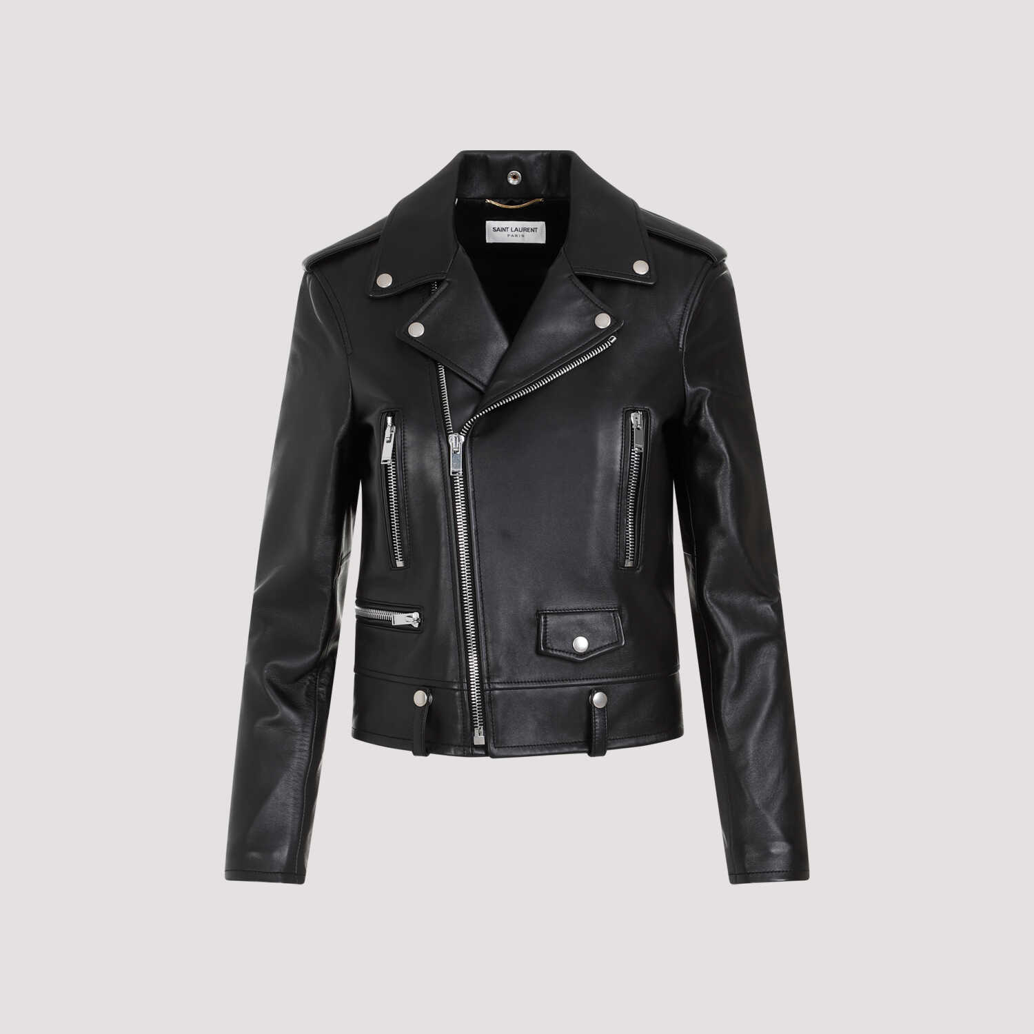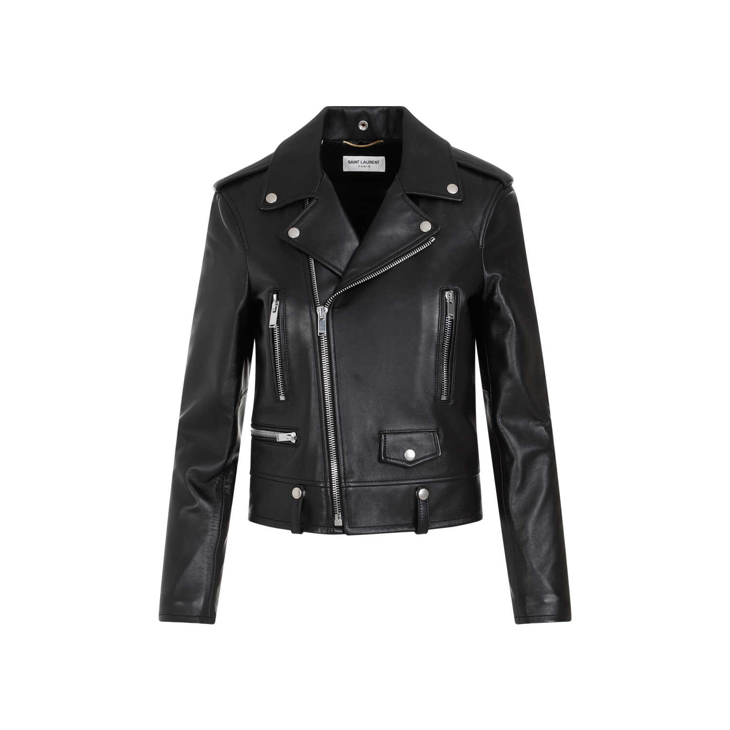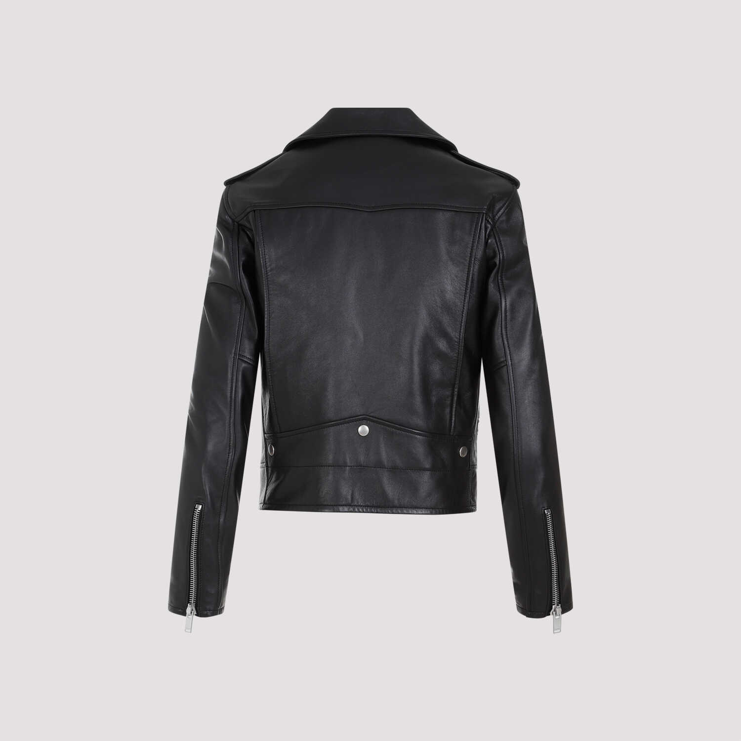 Saint Laurent Black Lamb Leather Motor Jacket. Pure black lamb leather jacket, notched collar, front zipped fastening, front three zipped pocket, front buttoned pocket, tonal leather strap on the shoulders, long sleeves, zipped cuffs, straight hem. Tonal stitching, buttoned details on the neck and on the back.