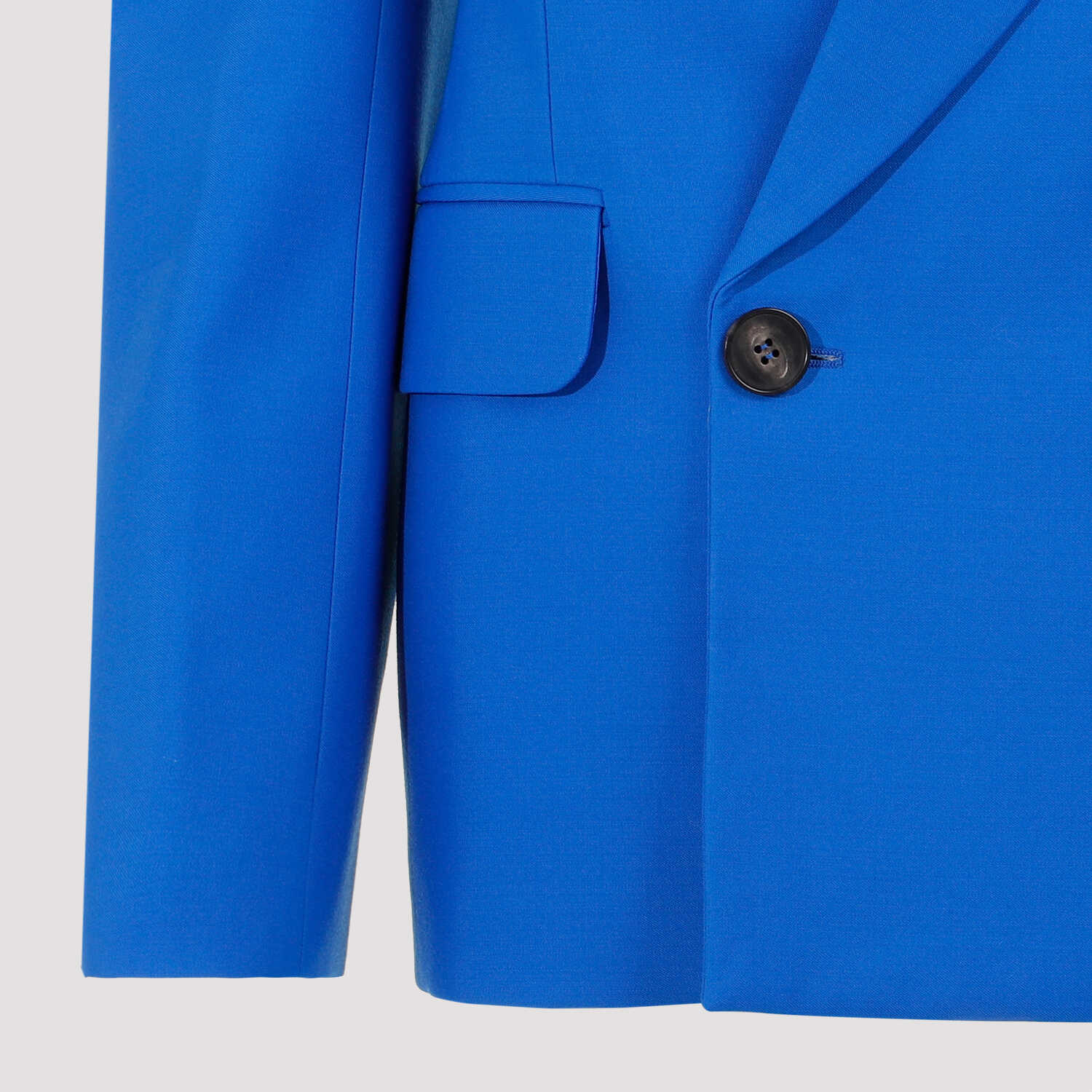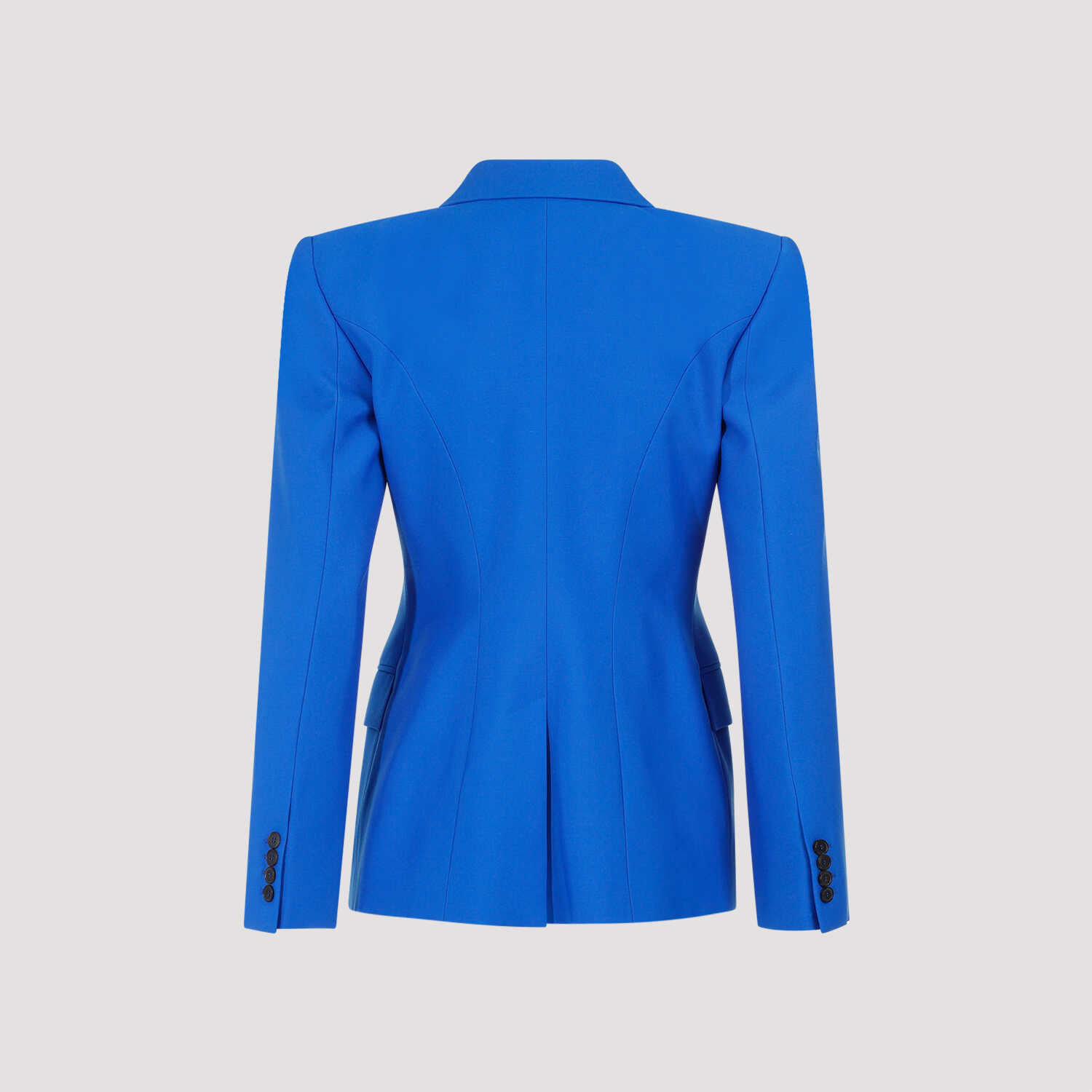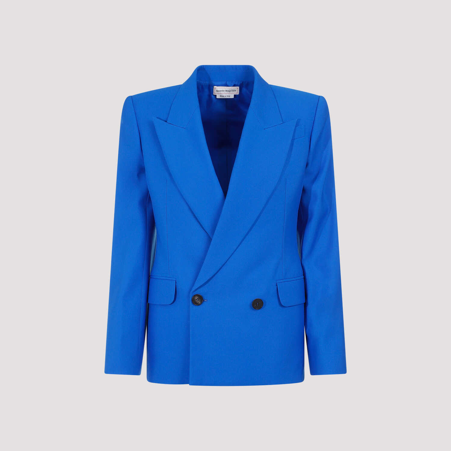 Alexander McQueen Galactic Blue Wool Jacket. Pure blue wool jacket, notched collar, front buttoned fastening, double breast style, side flap pockets, long sleeves, buttoned cuffs, straight hem. Fully lined.