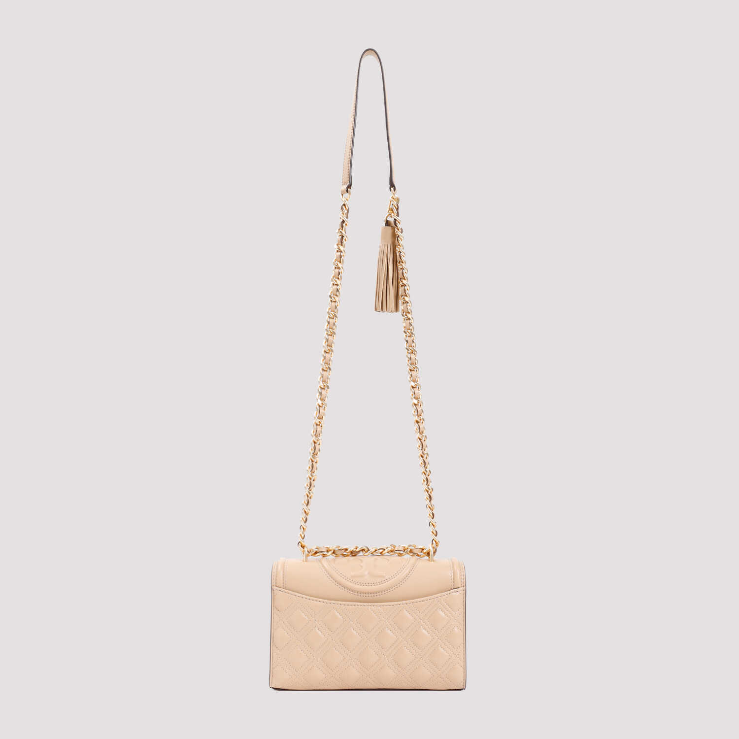 Tory Burch Fleming Small Beige Grained Lamb Leather Convertible Shoulder Bag. Crafted in pure beige grained leather, flap with embossed logo, satin golden chain shoulder strap on top with removable leather keychain, magnetic closure, pocket on the back and two inner welt pocket and one zipped.