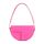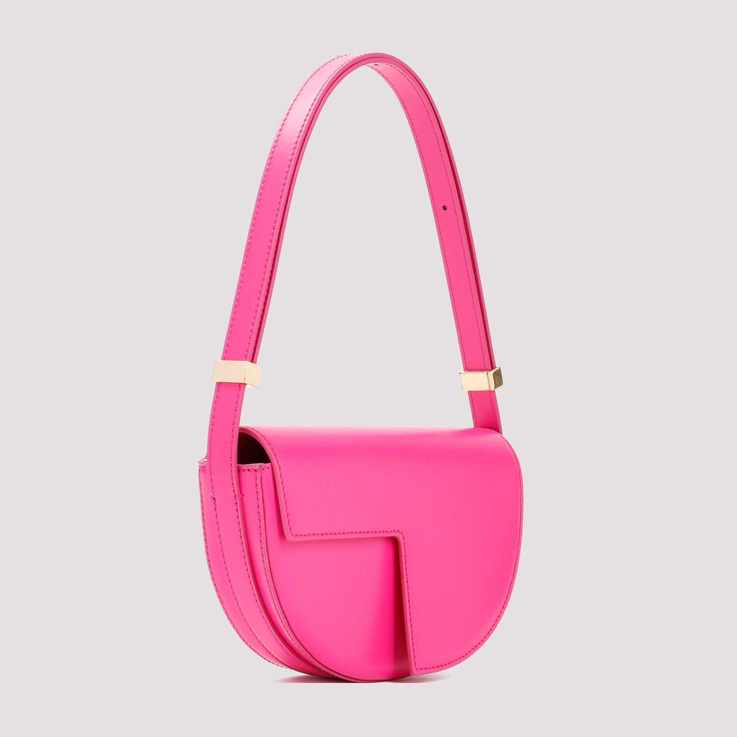 Patou Le Petit Fuchsia Leather Shoulder Bag. Fuchsia leather, golden-tone hardware, adjustable handle on the top, front flap with geometric cut-out detail, concealed magnetic closure, lined.
