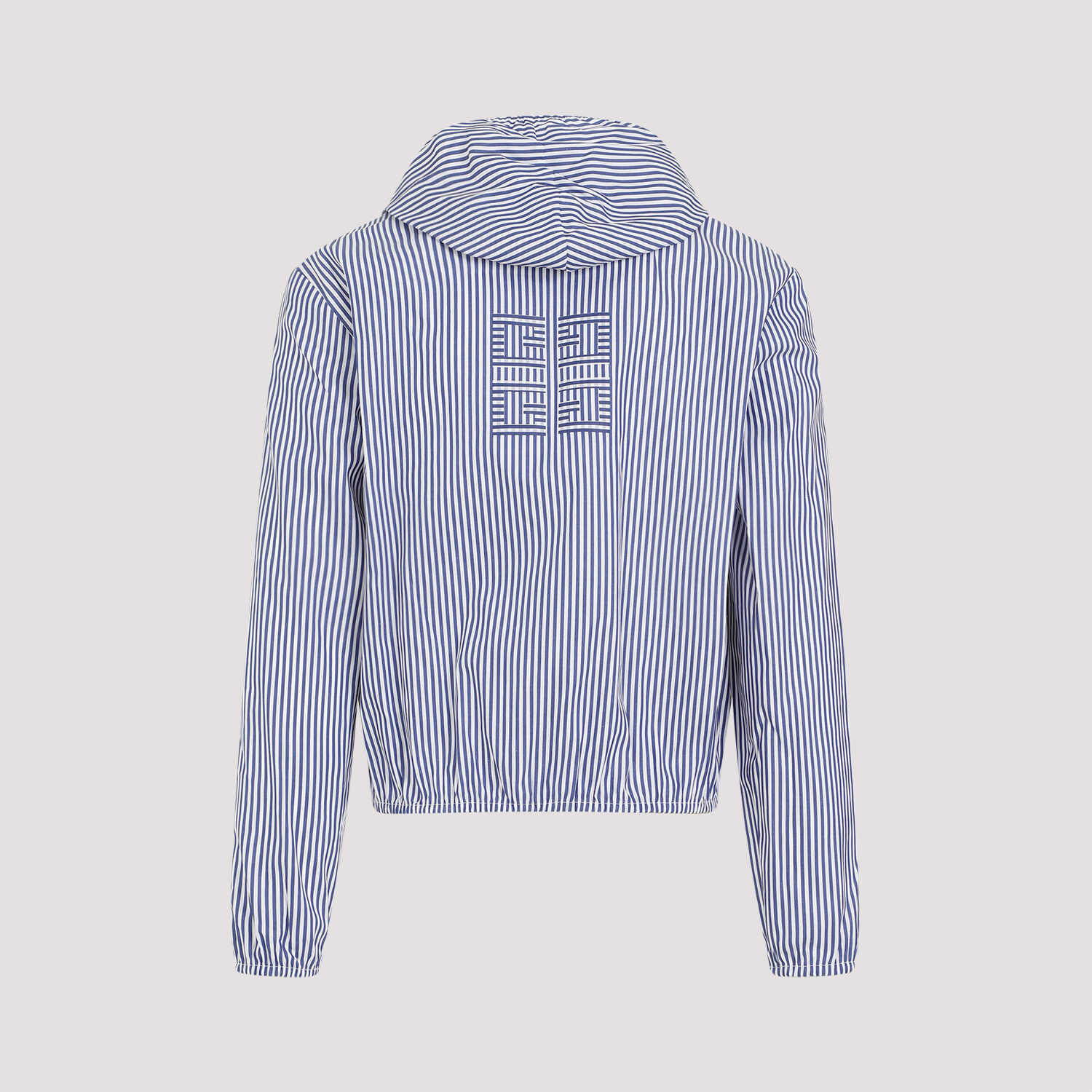 Givenchy Blue Cotton Shrunken Windbreaker Jacket. Pure cotton jacket, tonal hood, front zipped fastening, white embroidered logo on the chest, side zipped pockets, back 4G logo, long sleeves, straight hem. Blue and white stripes pattern all-over.