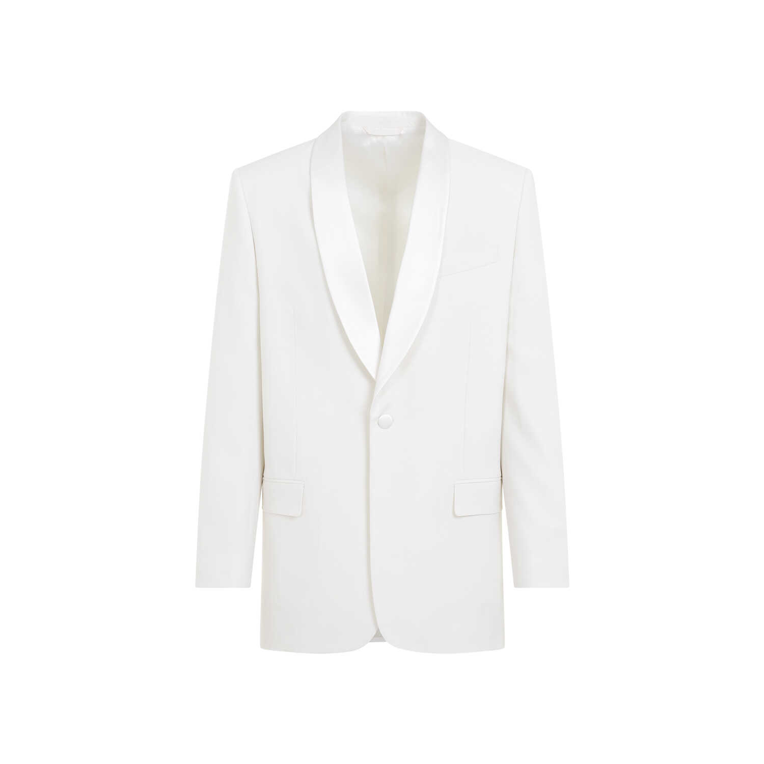 Givenchy Shawl Lapel White Wool-Mohair Jacket. Crafted from white virgin wool and mohair, tonal satin shawl lapels, single breasted, covered single button closure, breast pocket, two flap pockets on the front, reinforced shoulders, interior slip pockets, regular fit.