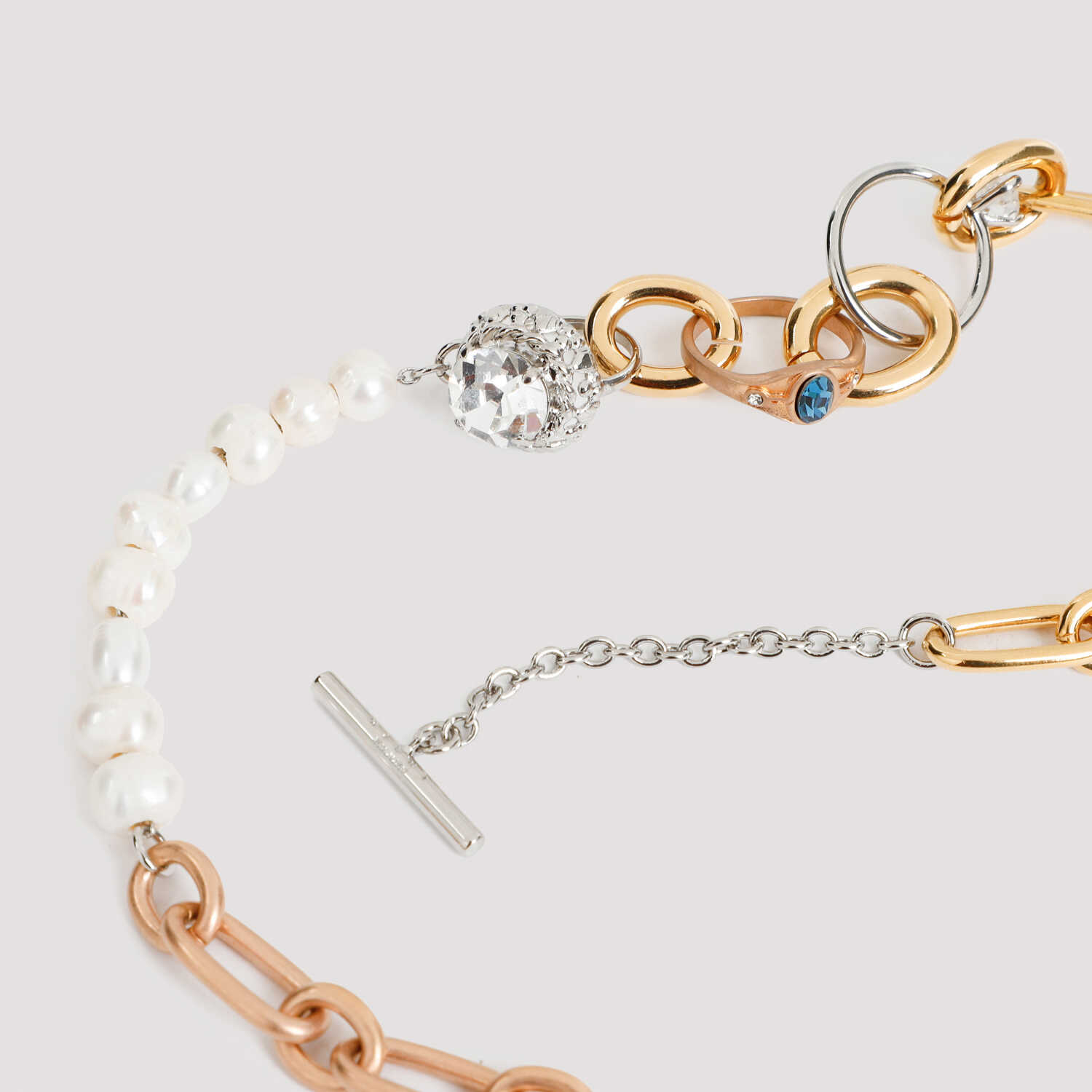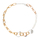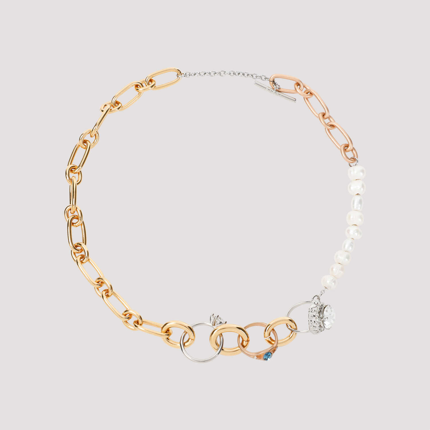 Marni Deep Gold Brass Necklace. Chain in deep gold brass necklace, three-ring charms with multicolor crystals, white pearls detail, back adjustable toggle closure.