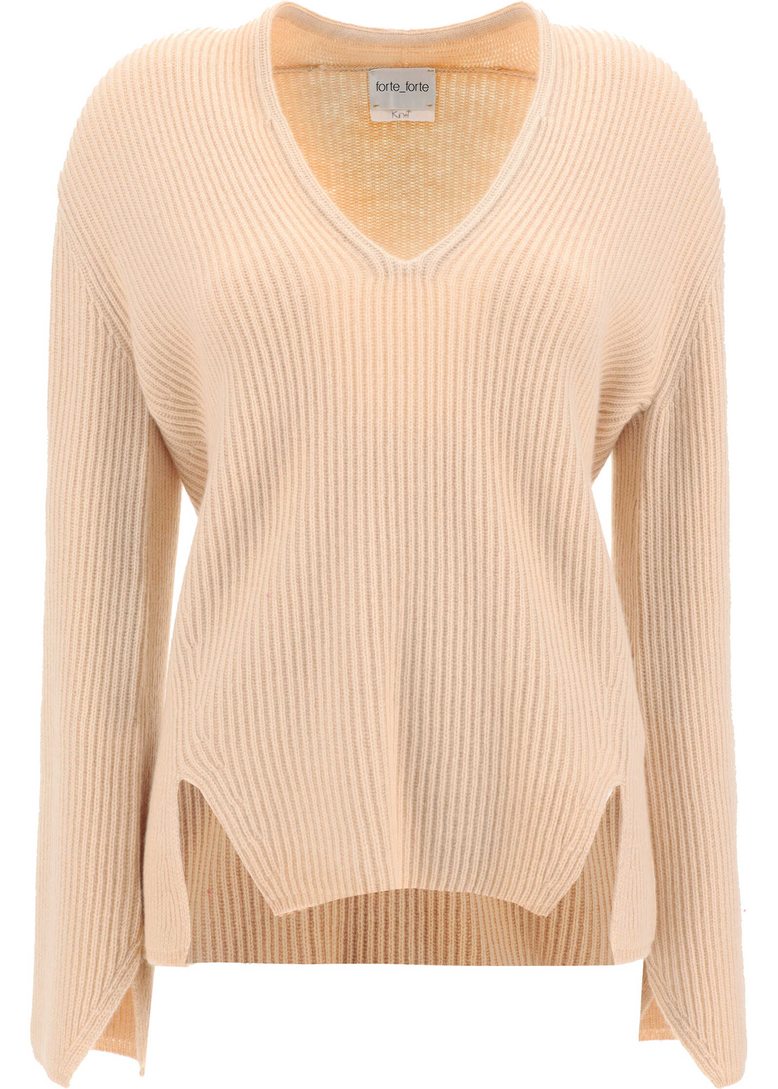 Virgin Wool Sweater by Forte_Forte, V-neck on front, all-over ribbed design, two slits on front, asymmetric cuffs, monochrome pattern, regular fit.
