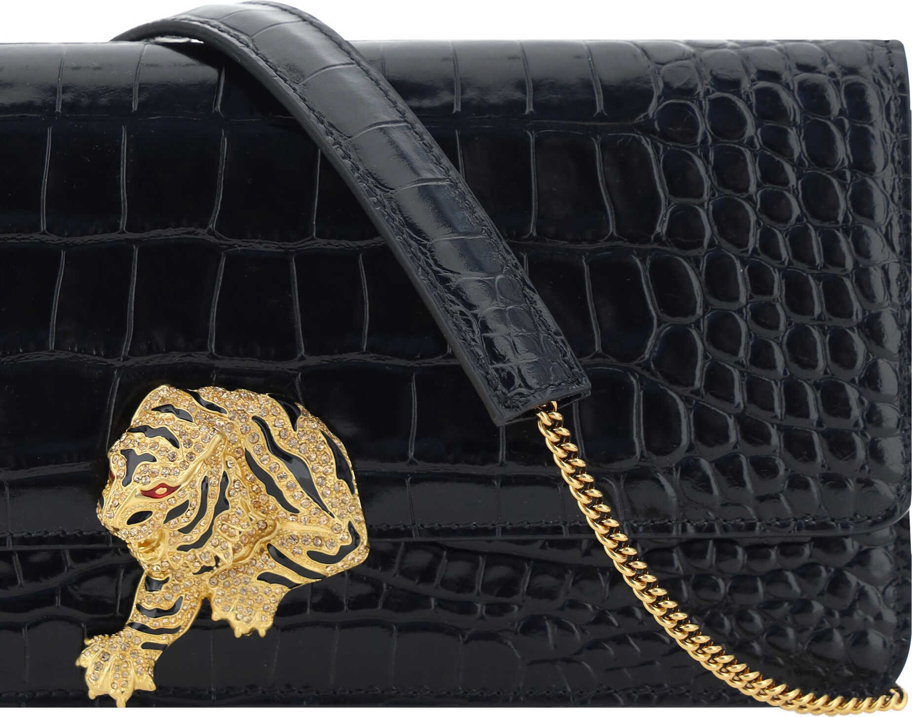 Roar Shoulder Bag by Roberto Cavalli, sculptural detail with three-dimensional tigers appliquéd on the magnetic flap of the clasp, gold-plated sliding chain strap, rigid geometric design, single internal compartment, tone-on-tone stitching, croco effect design.