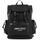 The Filmore backpack by Jimmy Choo is made of nylon with leather finishes and a rubber logo on the front pocket. It features a flap closure, buckles and drawstring, and a nylon interior with a zip pocket. The side pockets have flaps and buckles, while there is an additional zip pocket on the back. Padded shoulder straps, a top handle, and tonal metal accessories with a ruthenium finish complete the design.