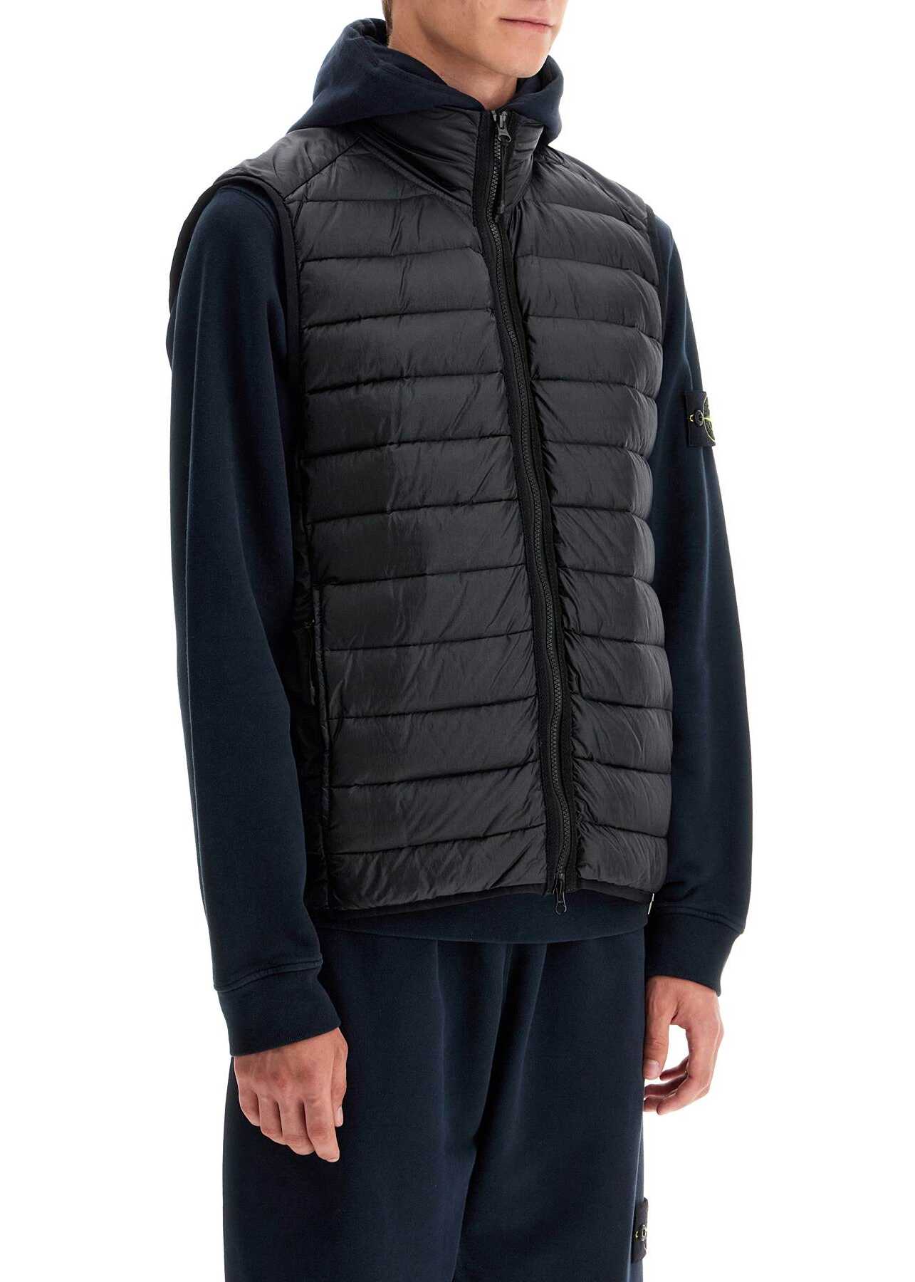 Stone Island high-neck vest crafted of Loom Woven Chambers R-Nylon Down-TC, a garment-dyed recycled nylon fabric featuring seamless quilting and lightweight direct-injection 90/10 duck down padding. Finished with stretch tape trims and the signature logo badge at the hip, this style is fastened with a double-slider zip and has two zippered hand pockets. Regular fit. The model is 187 cm tall and wears a size L.