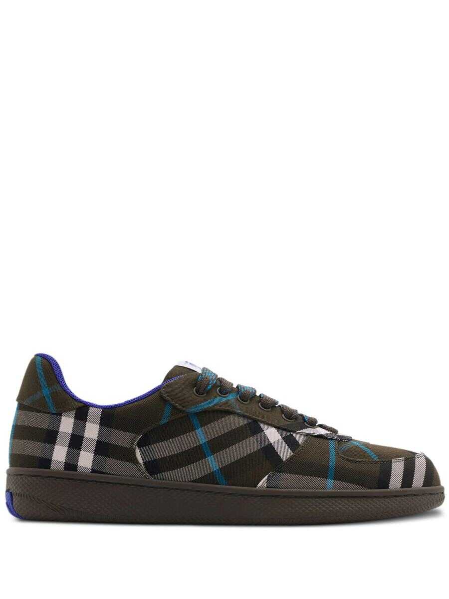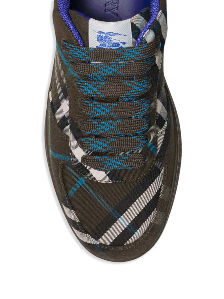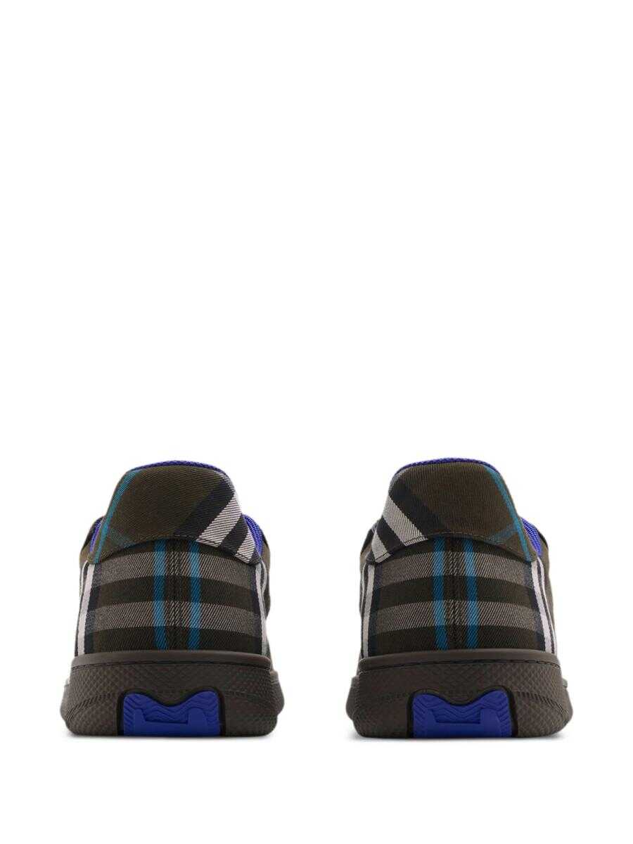 brown/beige/blue cotton/leather panelled design check pattern logo patch at the tongue signature Equestrian Knight motif front lace-up fastening round toe branded insole flat rubber sole