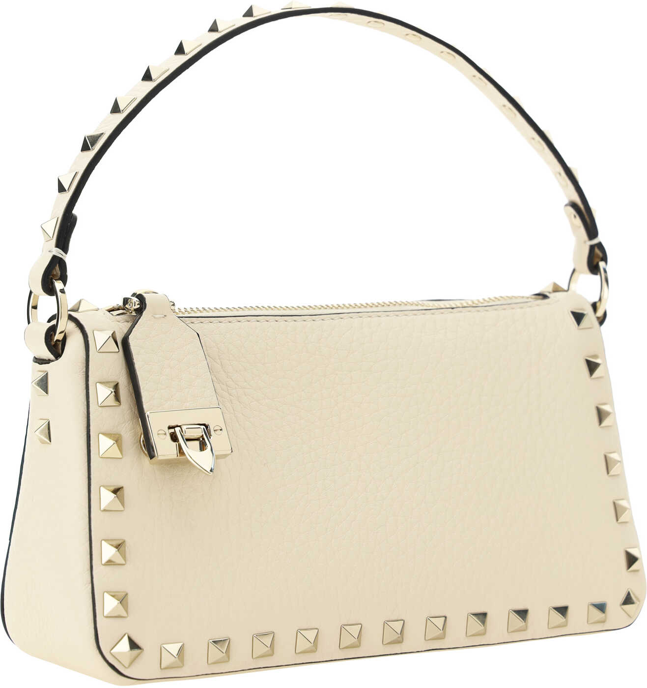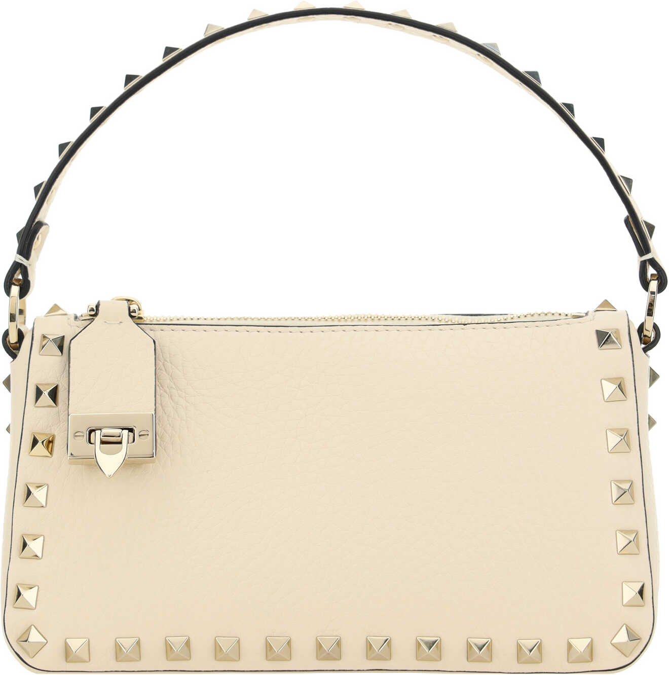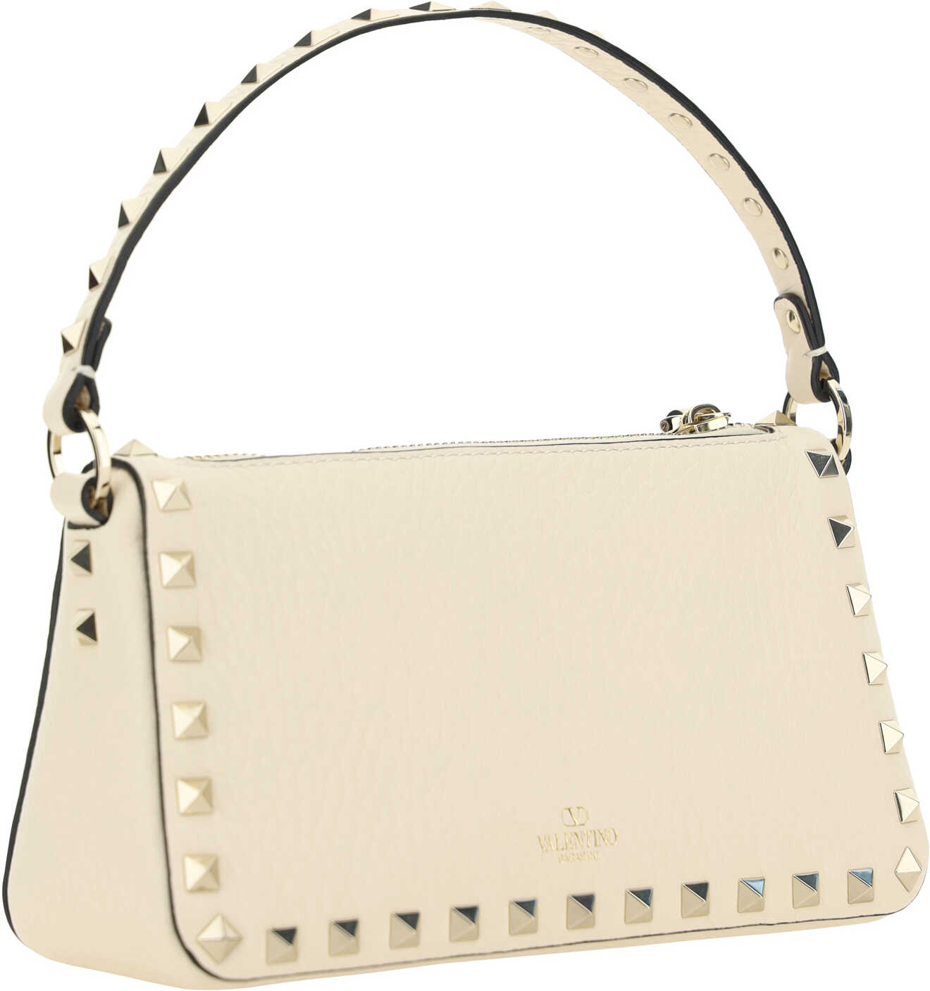 Calfskin Small Rockstud Shoulder Bag by Valentino Garavani, features an adjustable and removable flat shoulder strap, a rigid top handle, the brand's iconic Rockstud studs applied to the all-over piping, a hook-and-eye closure on the front, a top zipper closure, and an iconic brand monogram stamped on the back.