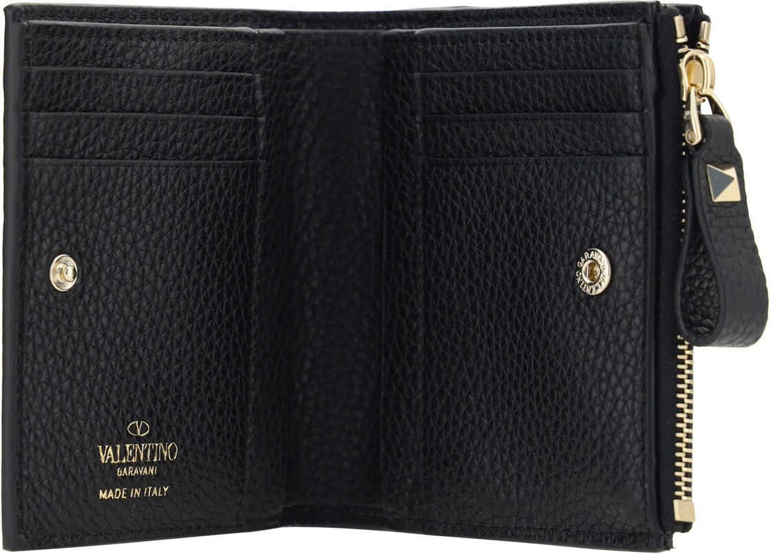 Calfskin Rockstud Wallet by Valentino Garavani, billfold model, interior snap-button closure, exterior coin pocket with zipper for closure, interior card slots, banknote compartment, iconic brand signature press-stamped on back and inside, profiles embellished with iconic Rockstud studs.