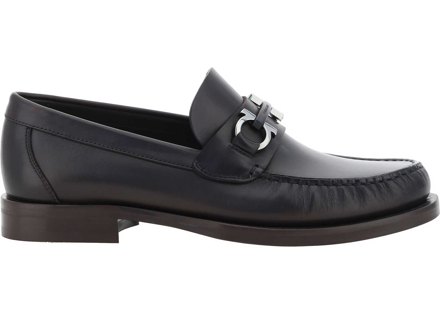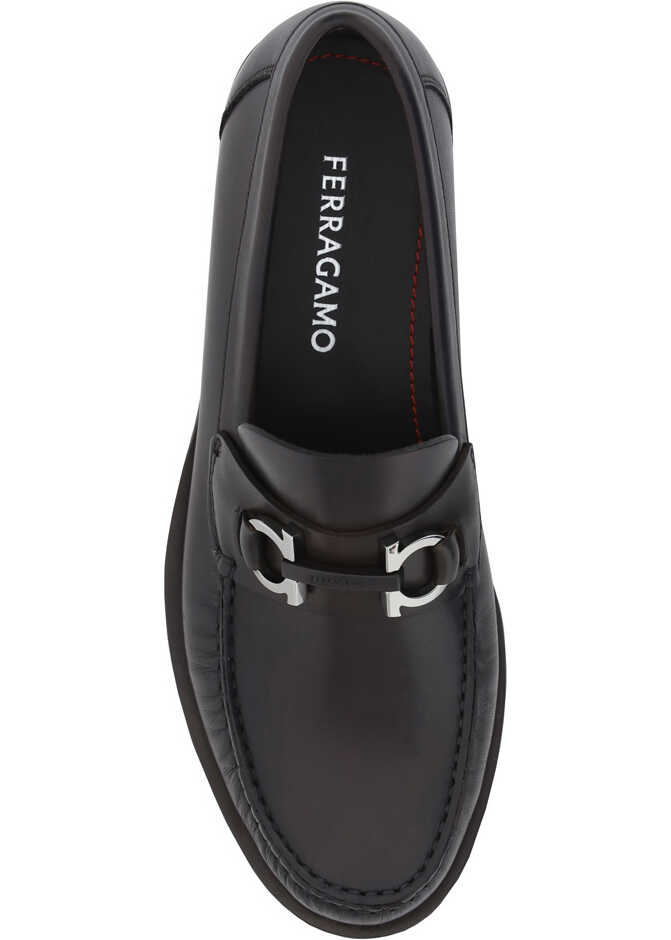 Calfskin Ornament Loafers by Ferragamo, slightly elongated round toe, leather block heel, three-dimensional iconic Gancini logo plaque detail on front, press-studded logo insole.