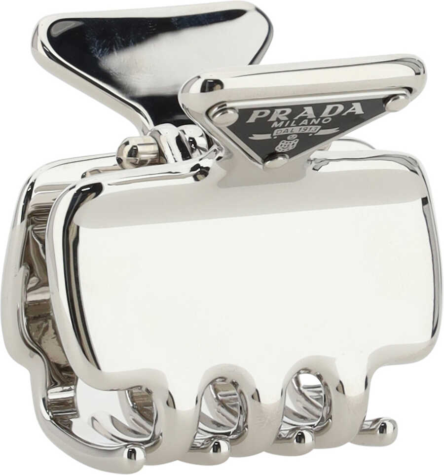 Hair Clip by Prada, mirror effect design, iconic enameled triangular plaque with brand signature applied at the top of the clip.