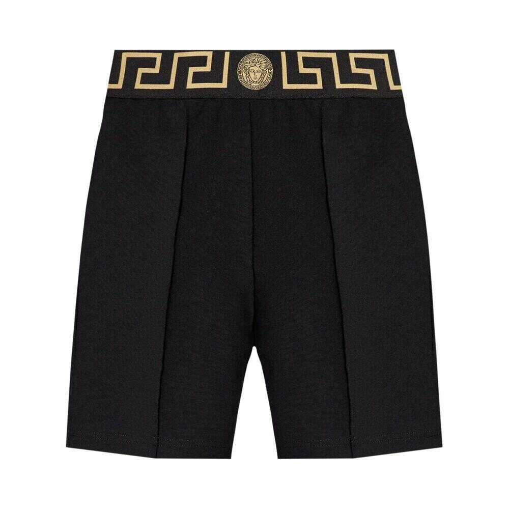 Black stretch-design signature greca detailing elasticated logo waistband raised seam detail thigh-length