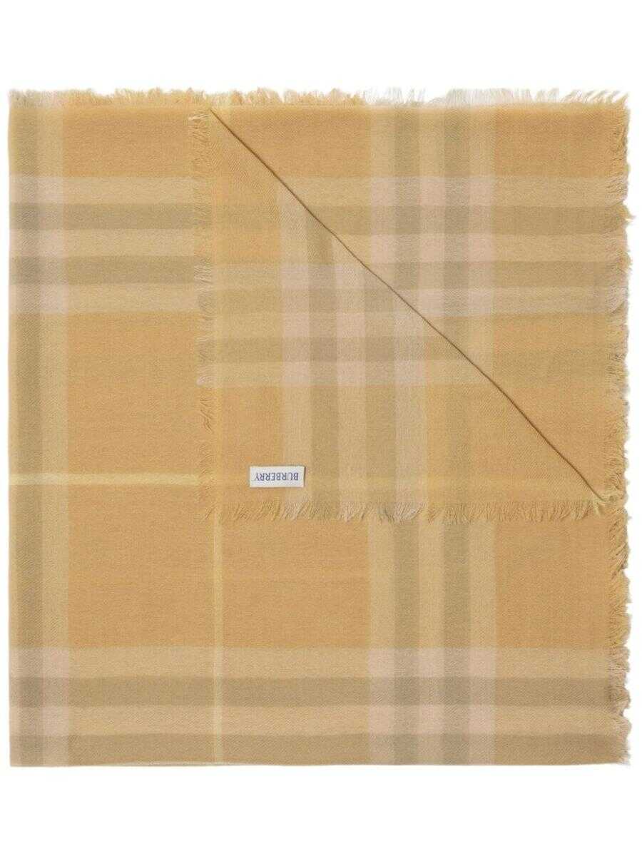beige wool fine knit Vintage Check pattern fringe detailing appliqué logo wraparound style