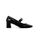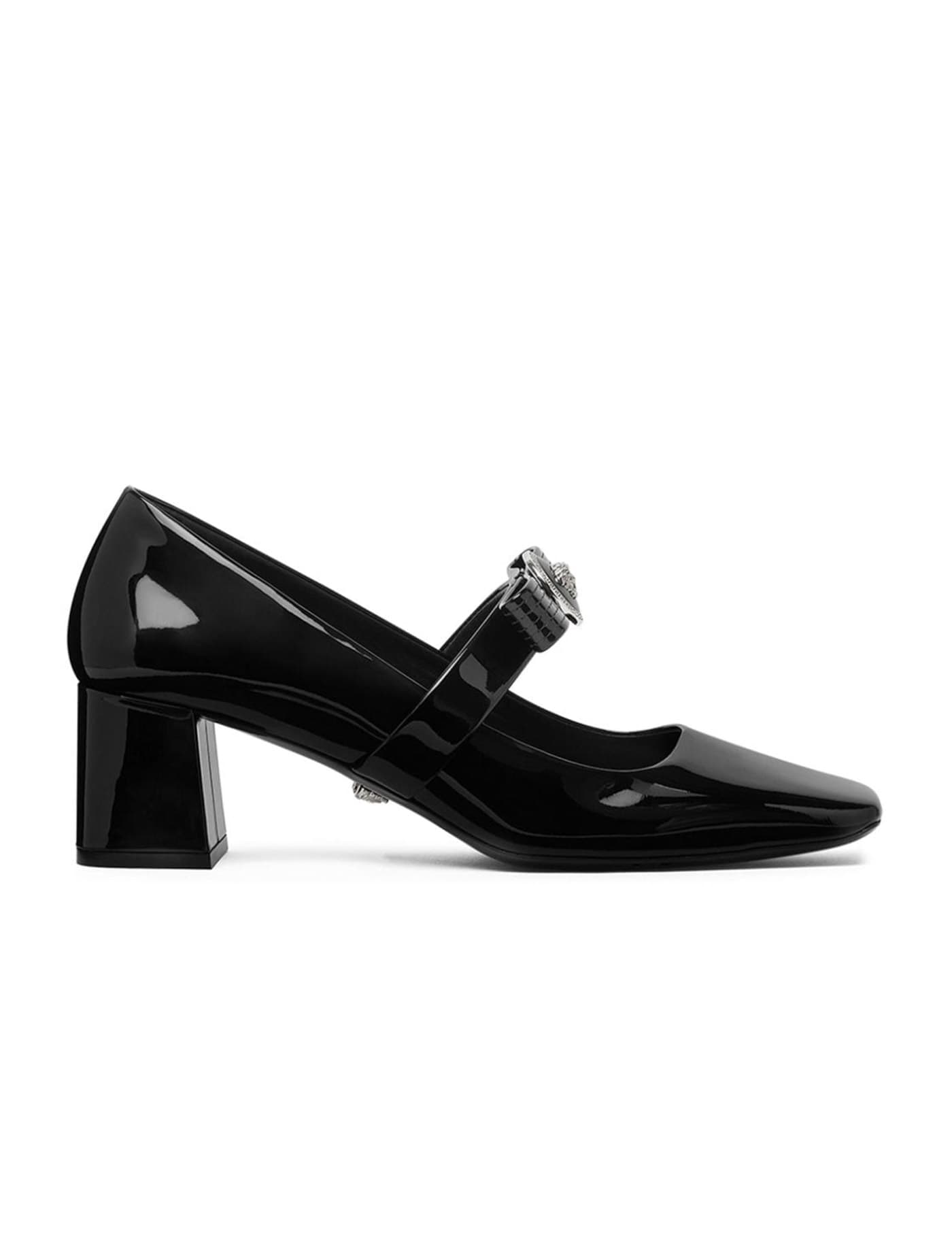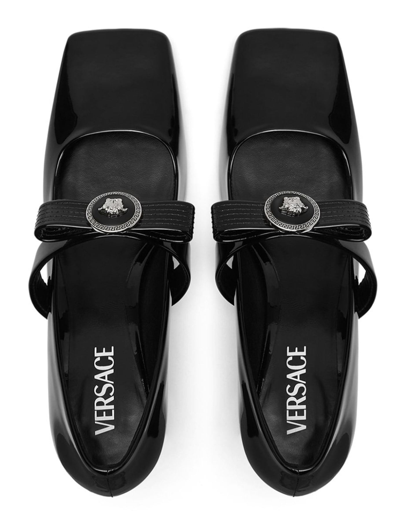 Black calf leather patent finish bow detailing medusa plaque detail slip-on style square toe branded insole mid block heel