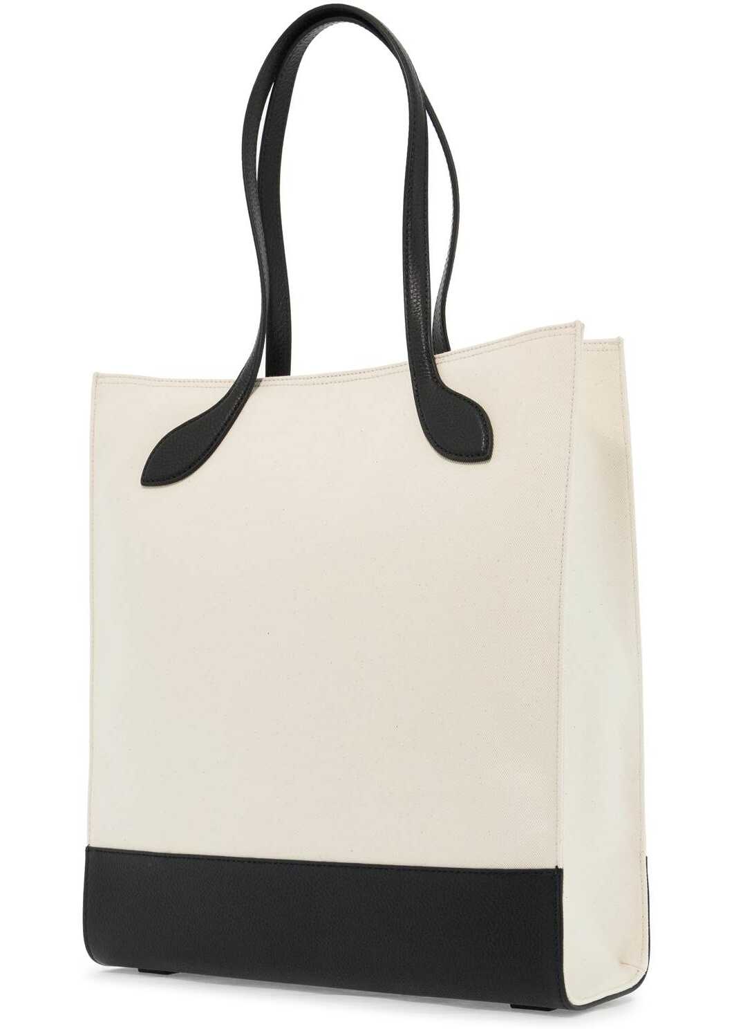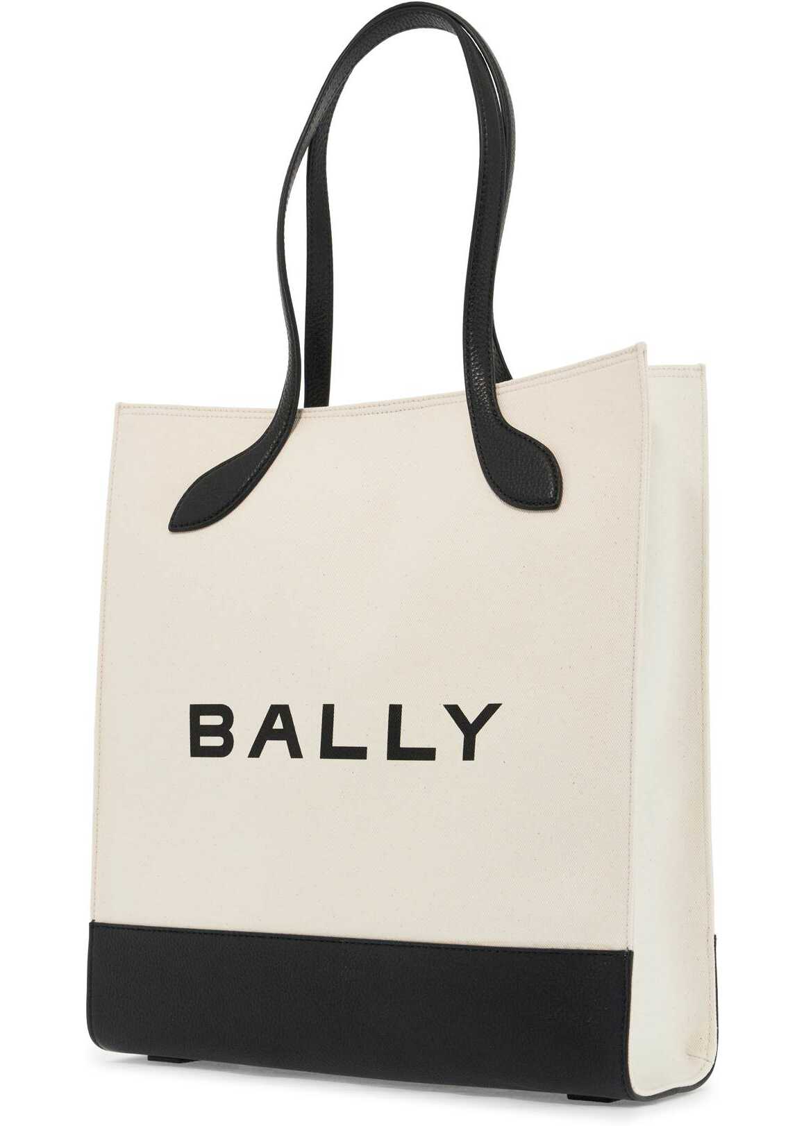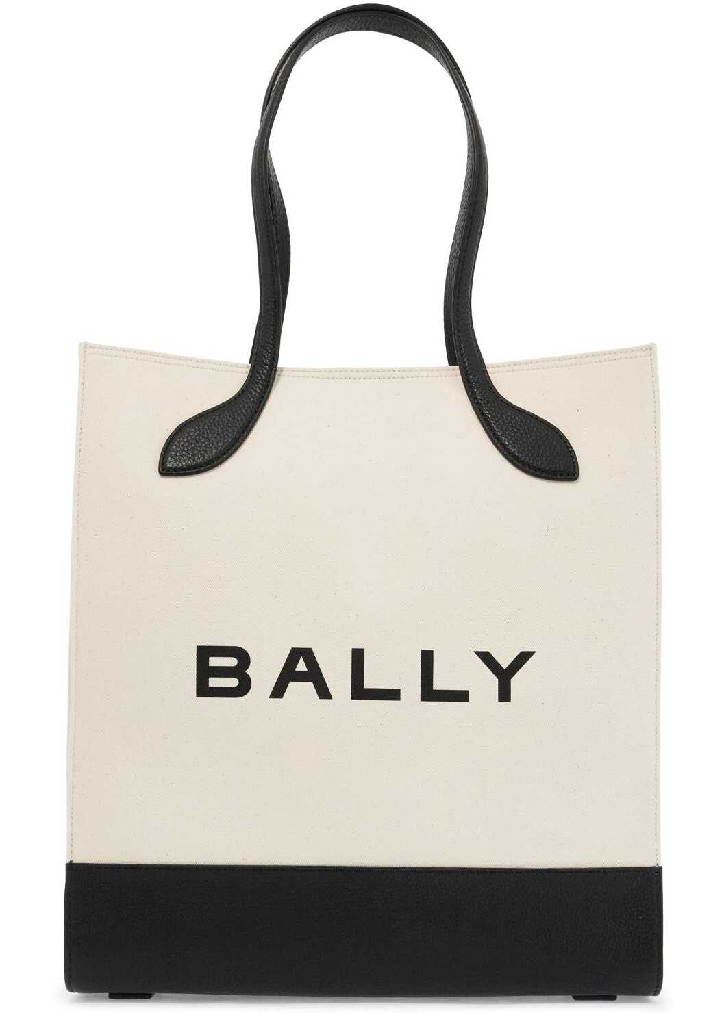 Bally Bar Keep On tote bag crafted in cotton-blend drill featuring contrasting lettering logo print at front. Leather double handle and base, magnetic closure, unlined interiore with one zippered pocket and gold-finished metalware.
