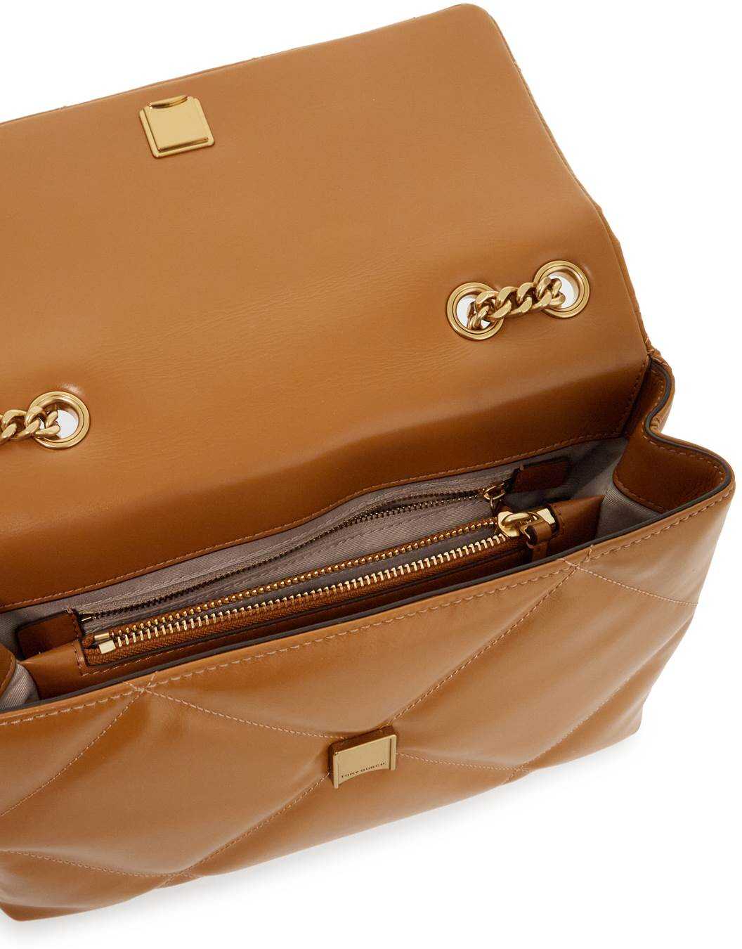 The Kira shoulder bag by Tory Burch is made of quilted nappa leather with a diamond pattern. The flap has a magnetic closure and is adorned with the iconic double T metal logo on the front. The interior is lined in fabric and features two compartments divided by a zip pocket, two open pockets, and an additional zip pocket. The design can be converted thanks to the chain strap that can be doubled for a shoulder look.