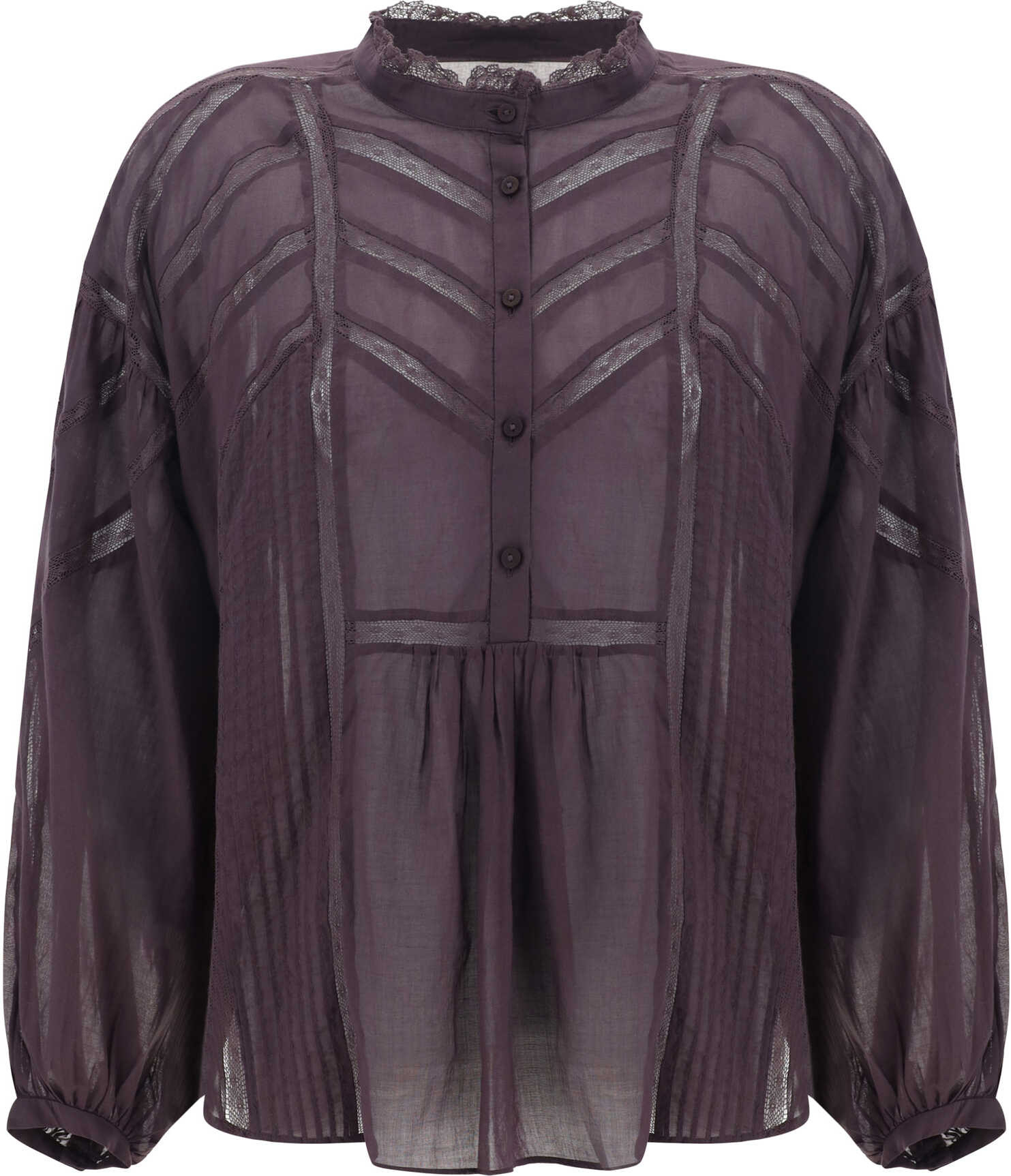 Cotton Gelma Shirt by Marant Etoile, mandarin collar with appliqué lace, half-bust buttons on front, adjustable button cuffs, semi-transparent appliqué lace detail on front and back, monochrome pattern, regular fit.