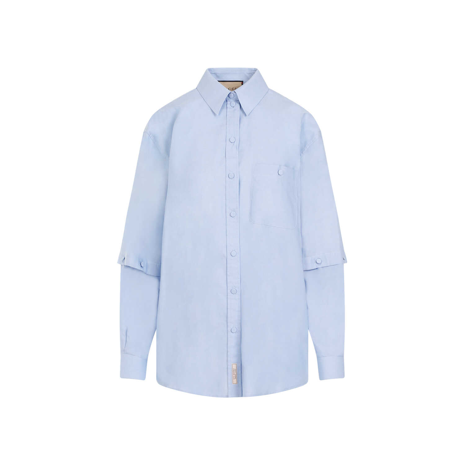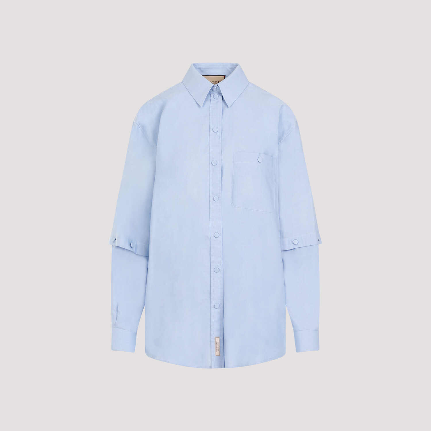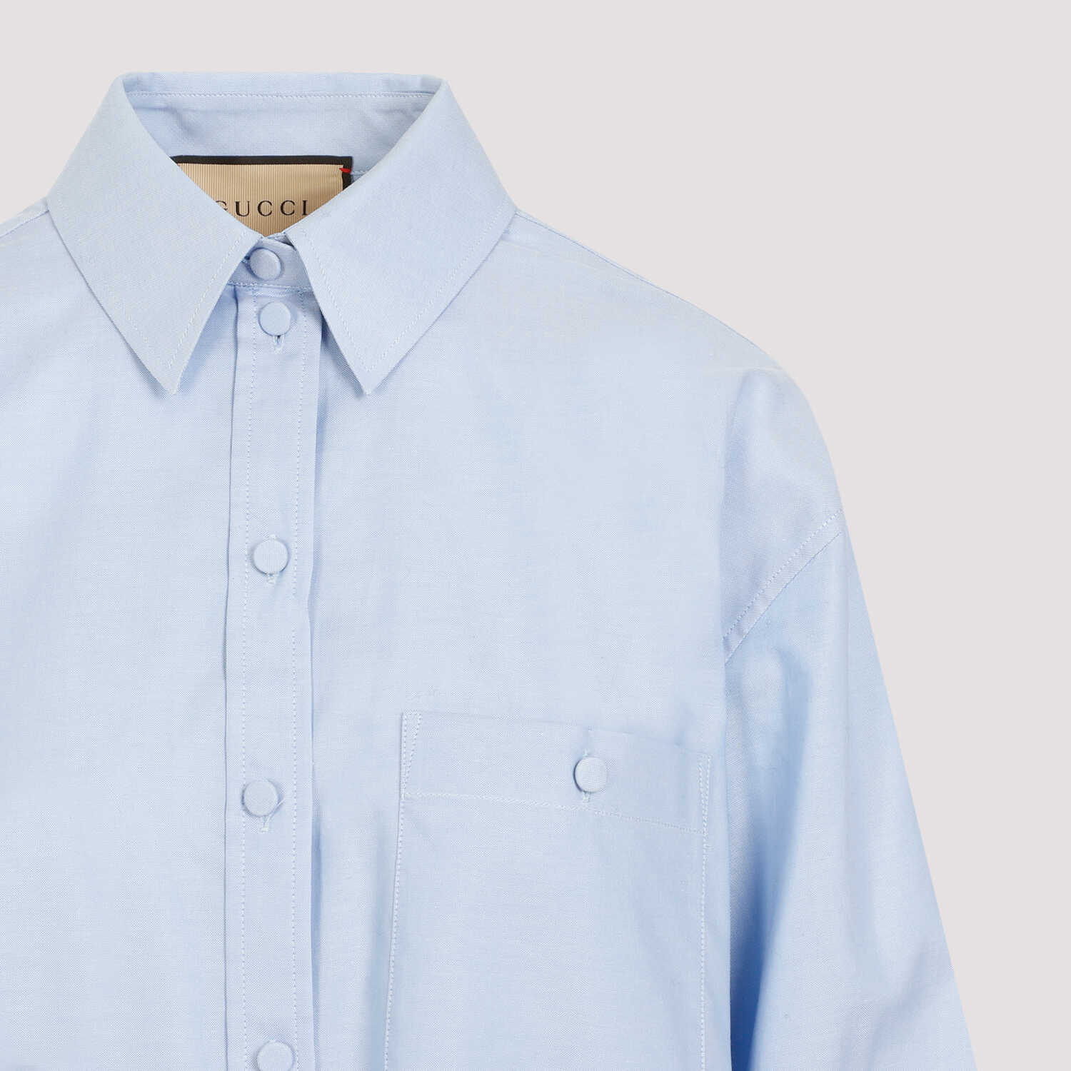 Gucci Sky Blue Cotton Oxford Shirt. Pointed collar, front buttoned fastening, front buttoned pocket, back flap detail, tonal stitching, dropped shoulder, double sleeves with buttoned details, buttoned cuffs, round hem, patch logo on the bottom.