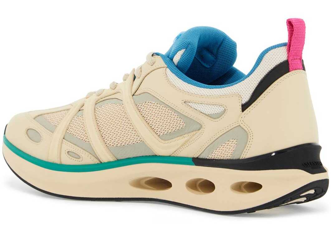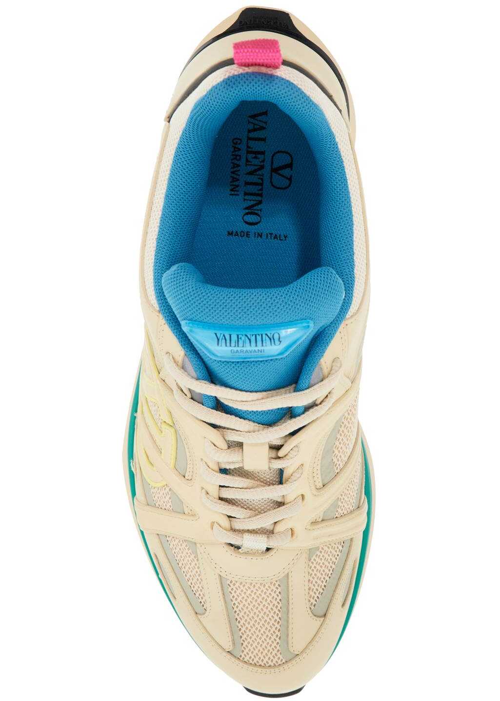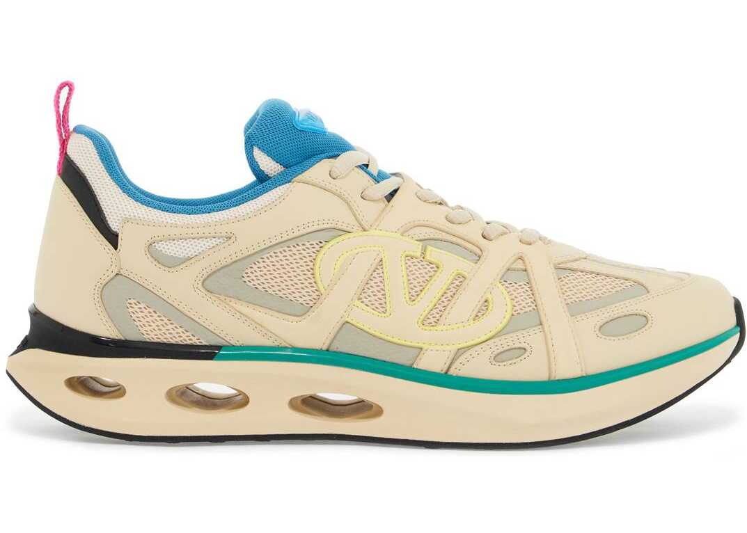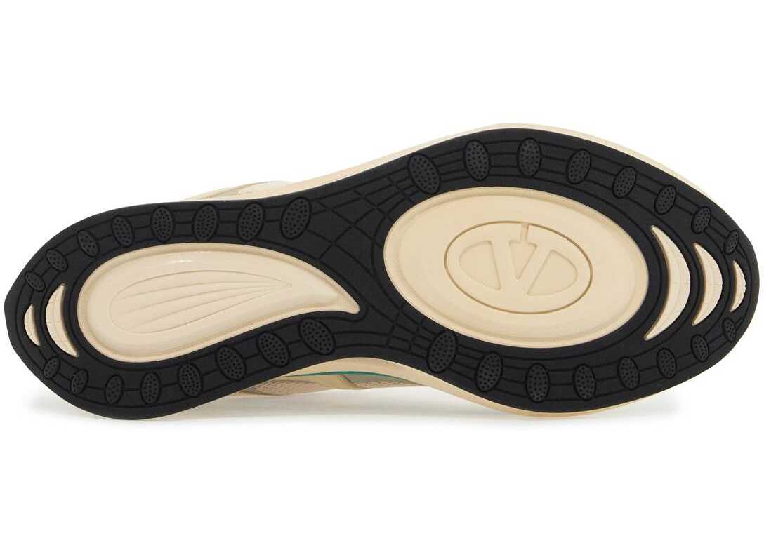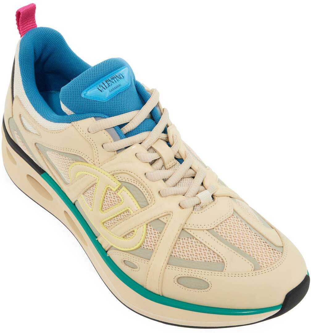 Valentino Garavani's Vlogo Easyjog low top sneakers feature a layered construction with smooth leather and mesh inserts, highlighted by the high frequency Vlogo Signature on the outer side. The design also includes rubber logo patches on the tongue, a tape pull tab on the back, a fabric lining with removable insole, and an ultra-lightweight rubber sole with cut out details, embossed logo lettering on the back, and contrasting tread. Spare laces included.