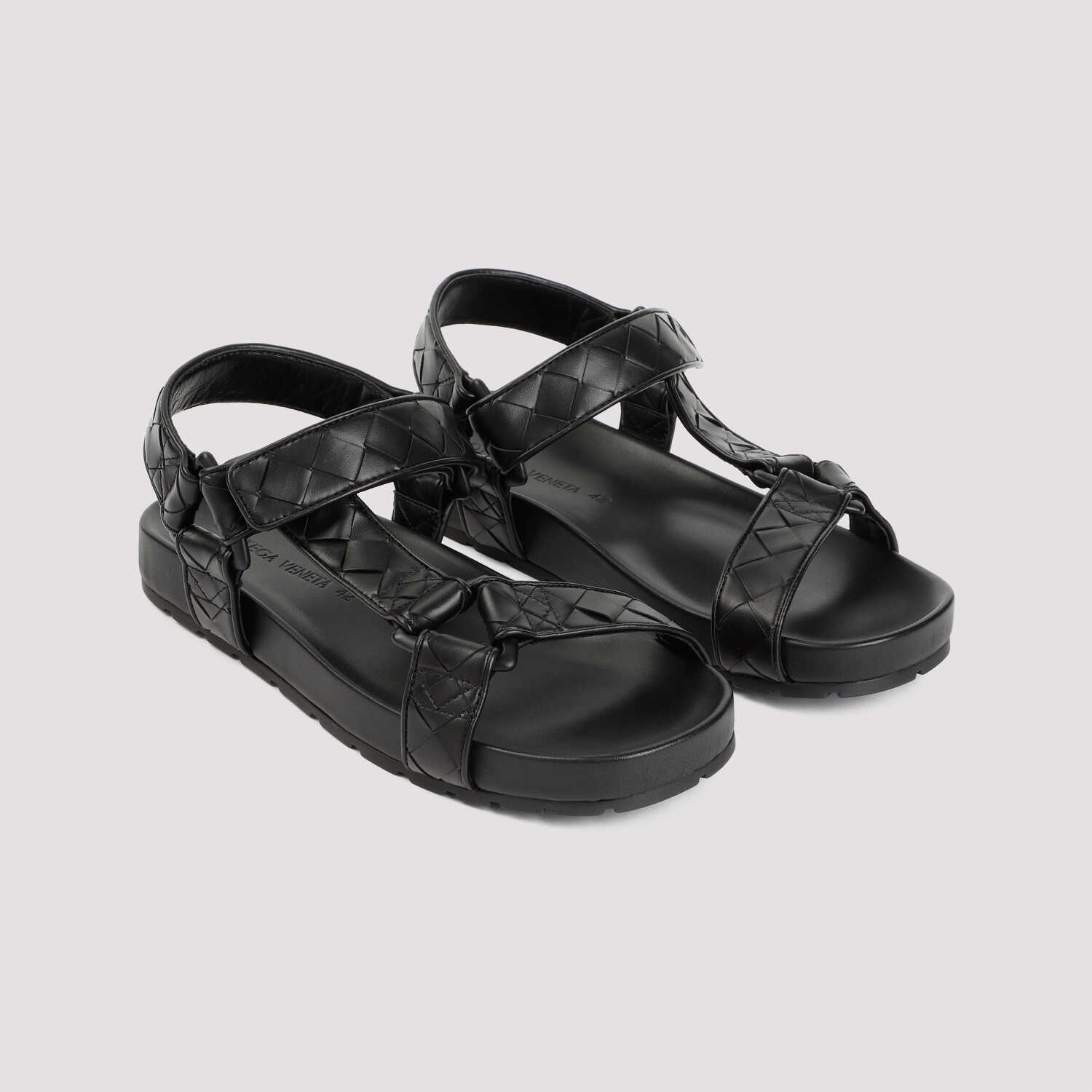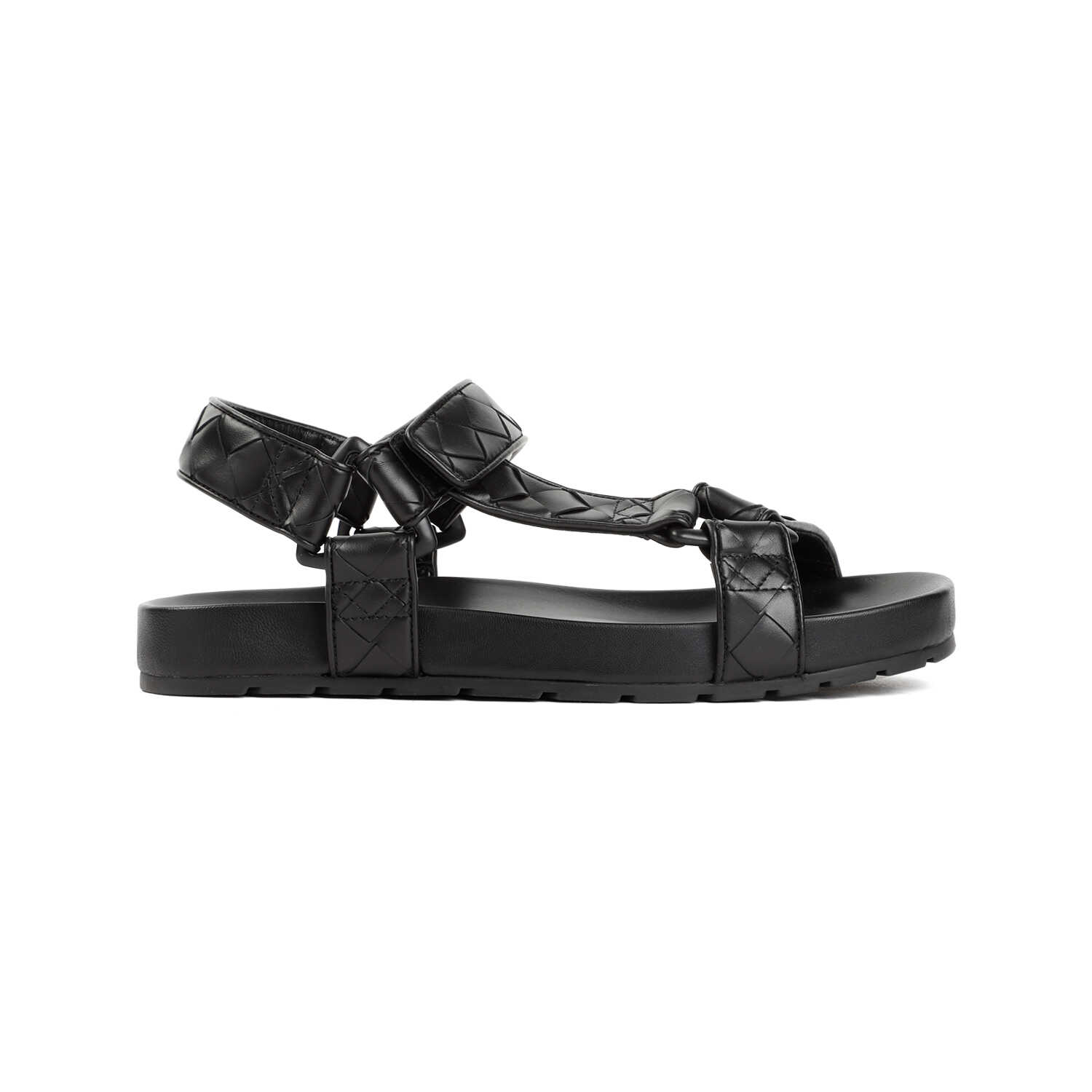 Bottega Veneta Black Calf Leather Intrecciato Slingback Sandal. Pure black calf leather sandal, round and open toe, front leather strap, adjustable ankle strap, tonal buckle, tonal sole. Signature intrecciato design on the leather strap.