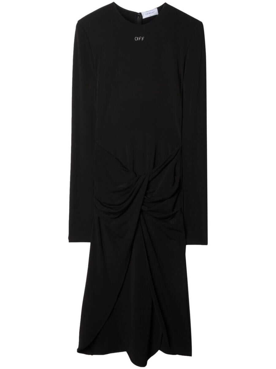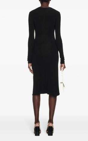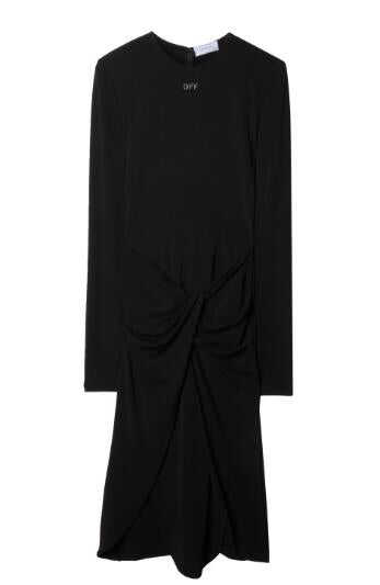black crepe texture stretch-design high neck long sleeves logo stamp to the front twist detailing front slit below-knee length