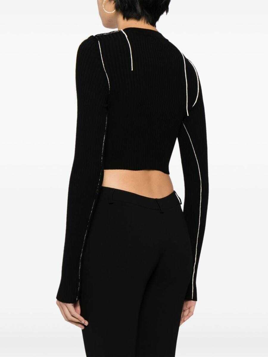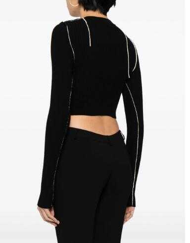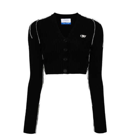 black wool blend wide ribbed embroidered logo at the chest V-neck front button fastening long sleeves straight hem cropped