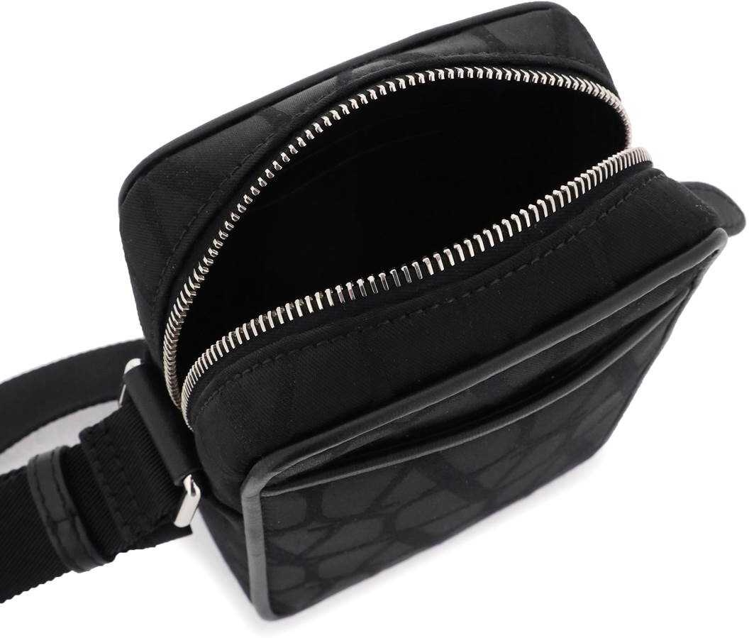 Small 'Black Iconographe' crossbody bag by Valentino Garavani crafted in nylon and characterized by iconic all-over monogram motif. It features flat front pocket, main compartment with zip closure, lined interior with two credit card slots. Adjustable ribbon shoulder strap with VLogo buckle. Palladium-finished metalware.