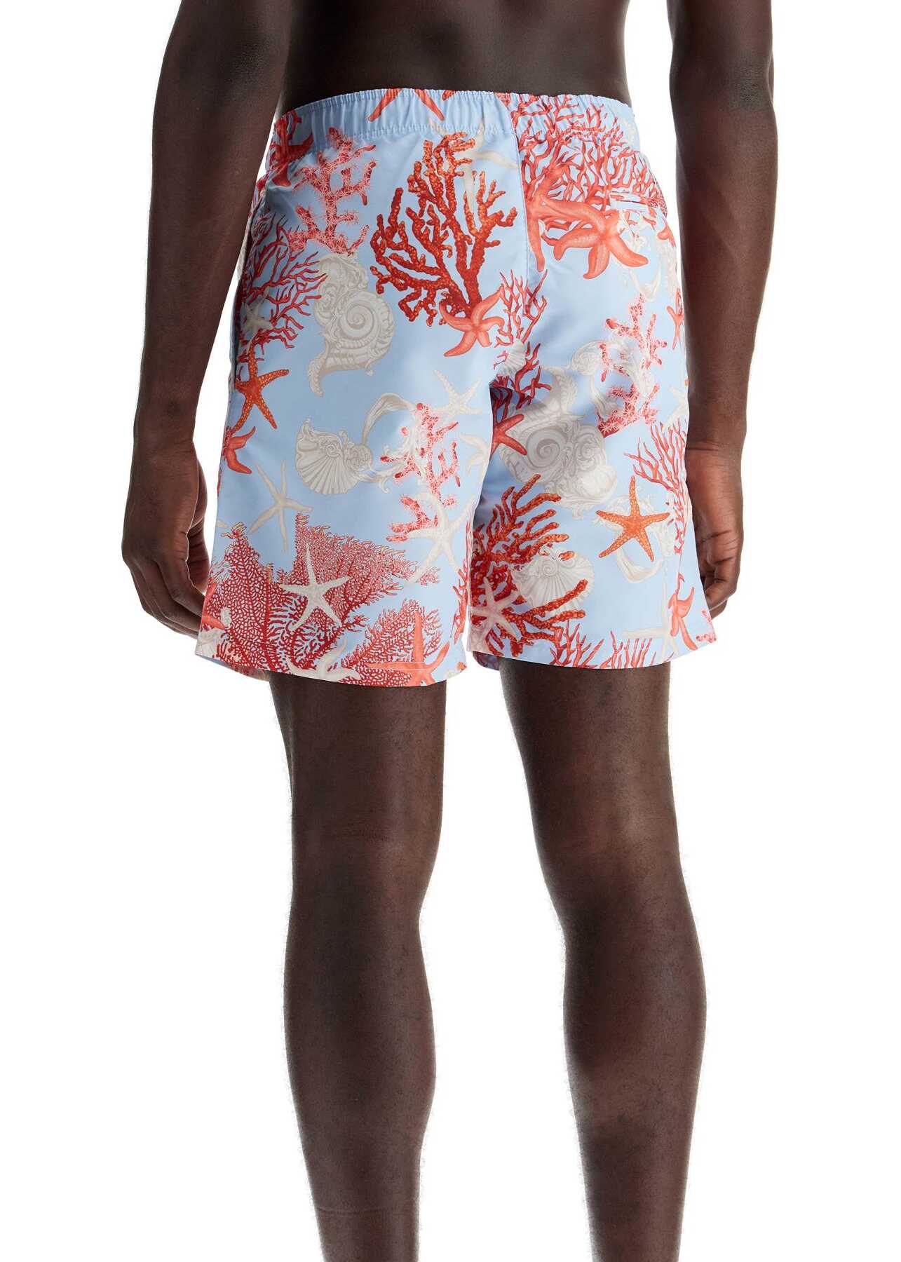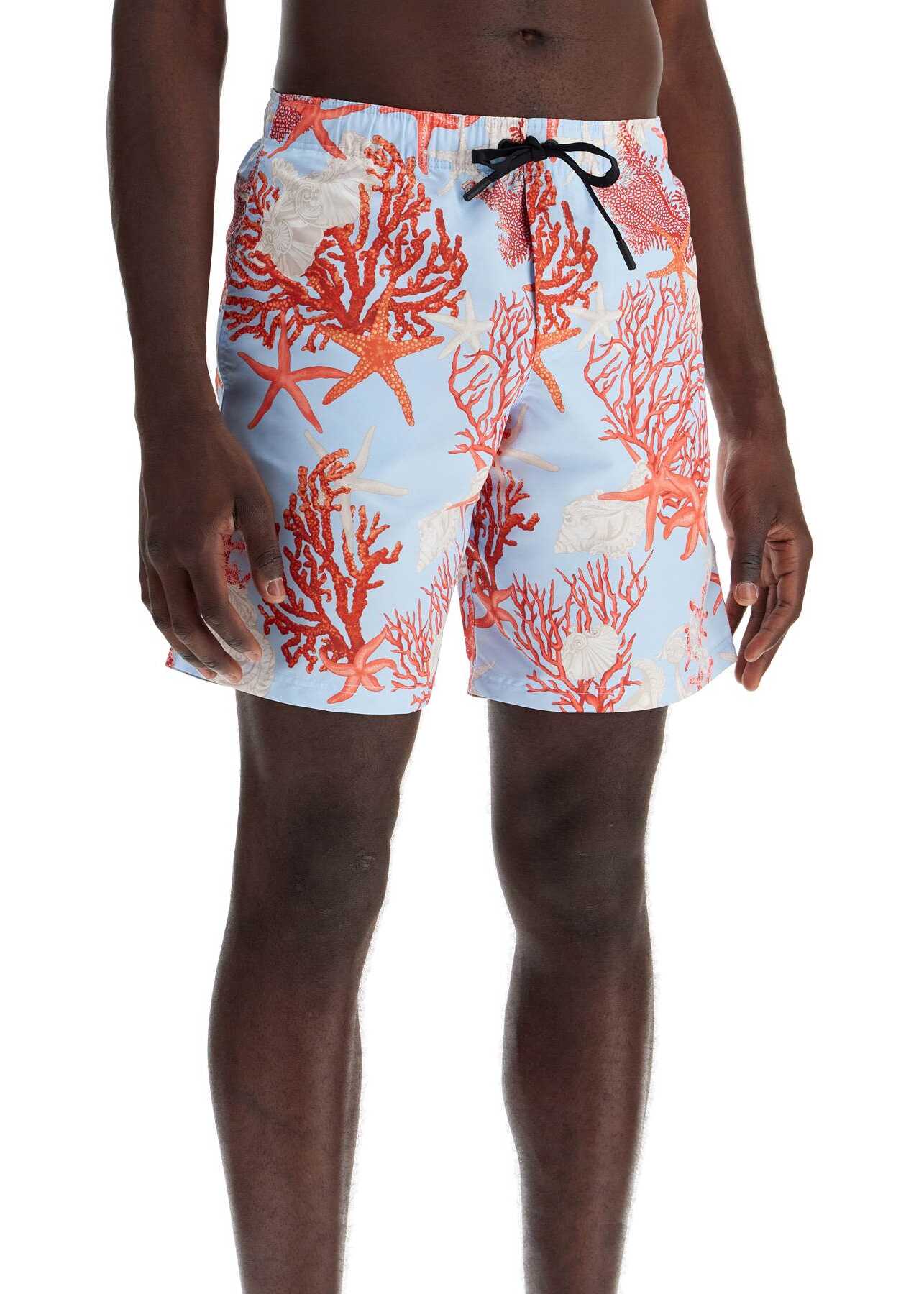 The Versace women's Bermuda shorts have a slim fit and are characterized by the all-over Barocco Sea print. They feature side pockets, a back pocket, and an elasticated waistband with drawstring. The inner lining is made of mesh. The model is 187 cm tall and wears size 3.