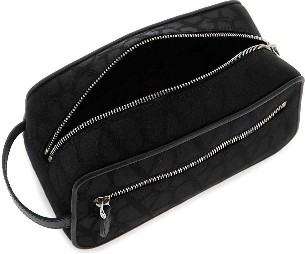 The Valentino Garavani beauty case is made of Toile Iconographe fabric and features a main compartment with a top zip closure, lined in satin and complete with an open pocket. It also has an additional front pocket with a zip and a side handle. The metal accessories have a silver finish.