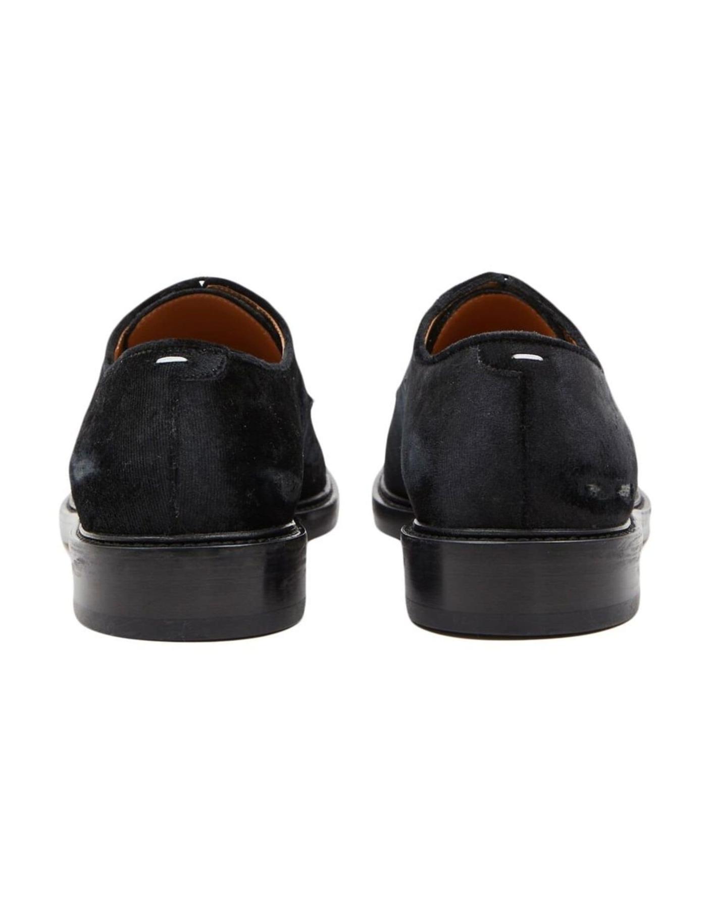 - distressed-finish lace-up shoes from Maison Margiela featuring velvet effect, distressed finish, front lace-up fastening, round toe, flat sole, branded insole and black.
