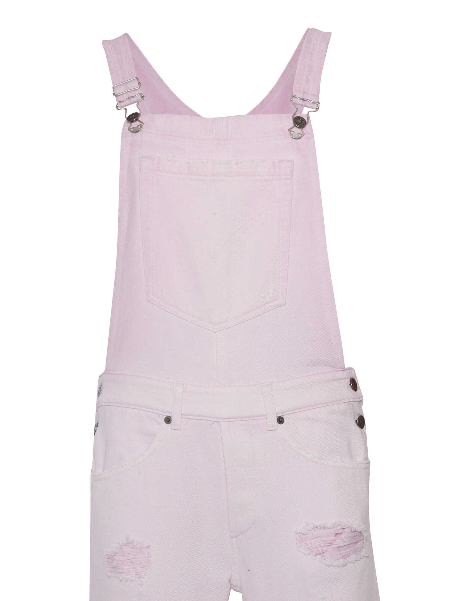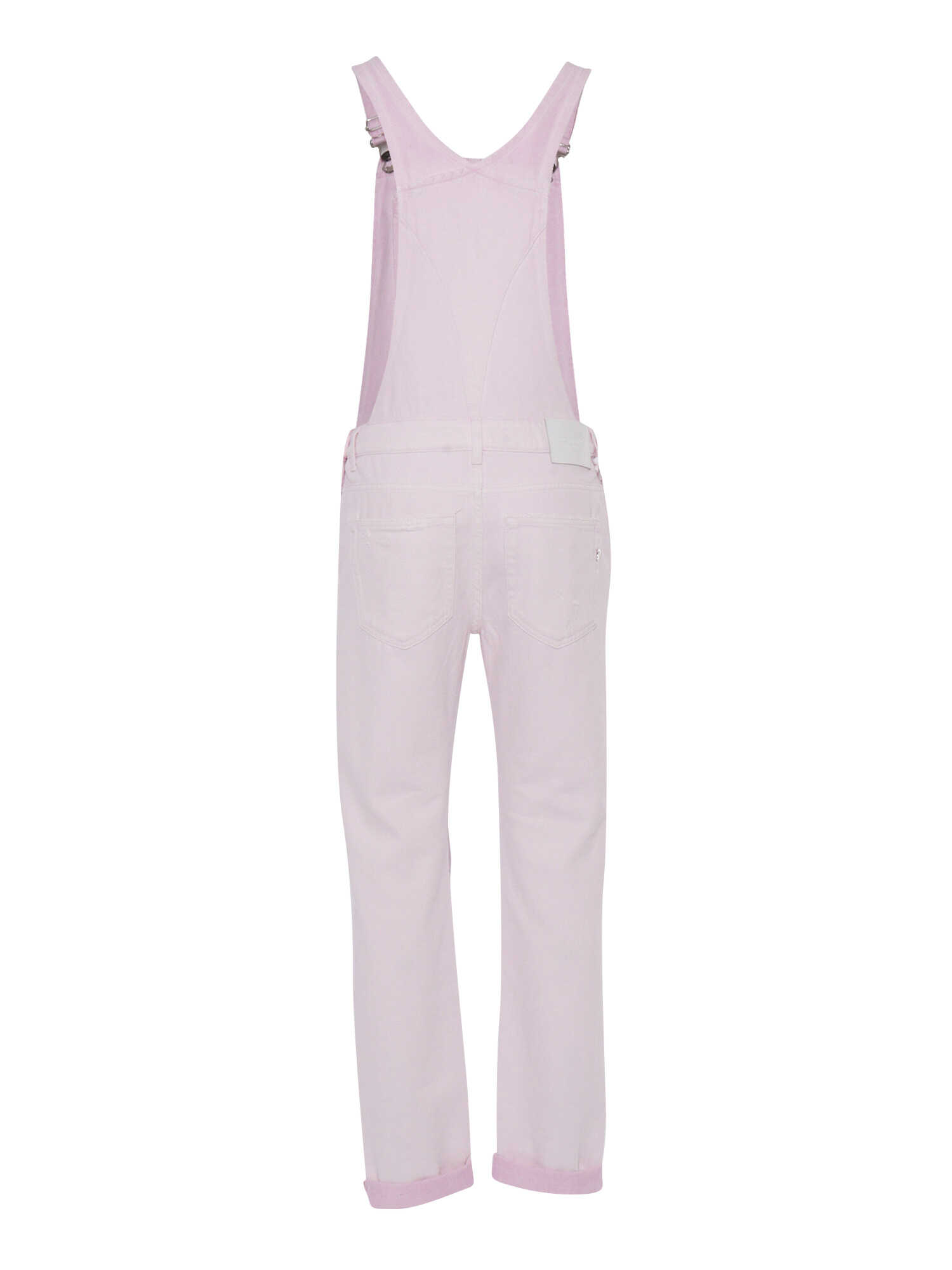 Women's pink denim overalls, 5 pockets, belt loops, turn-ups, fringed details.