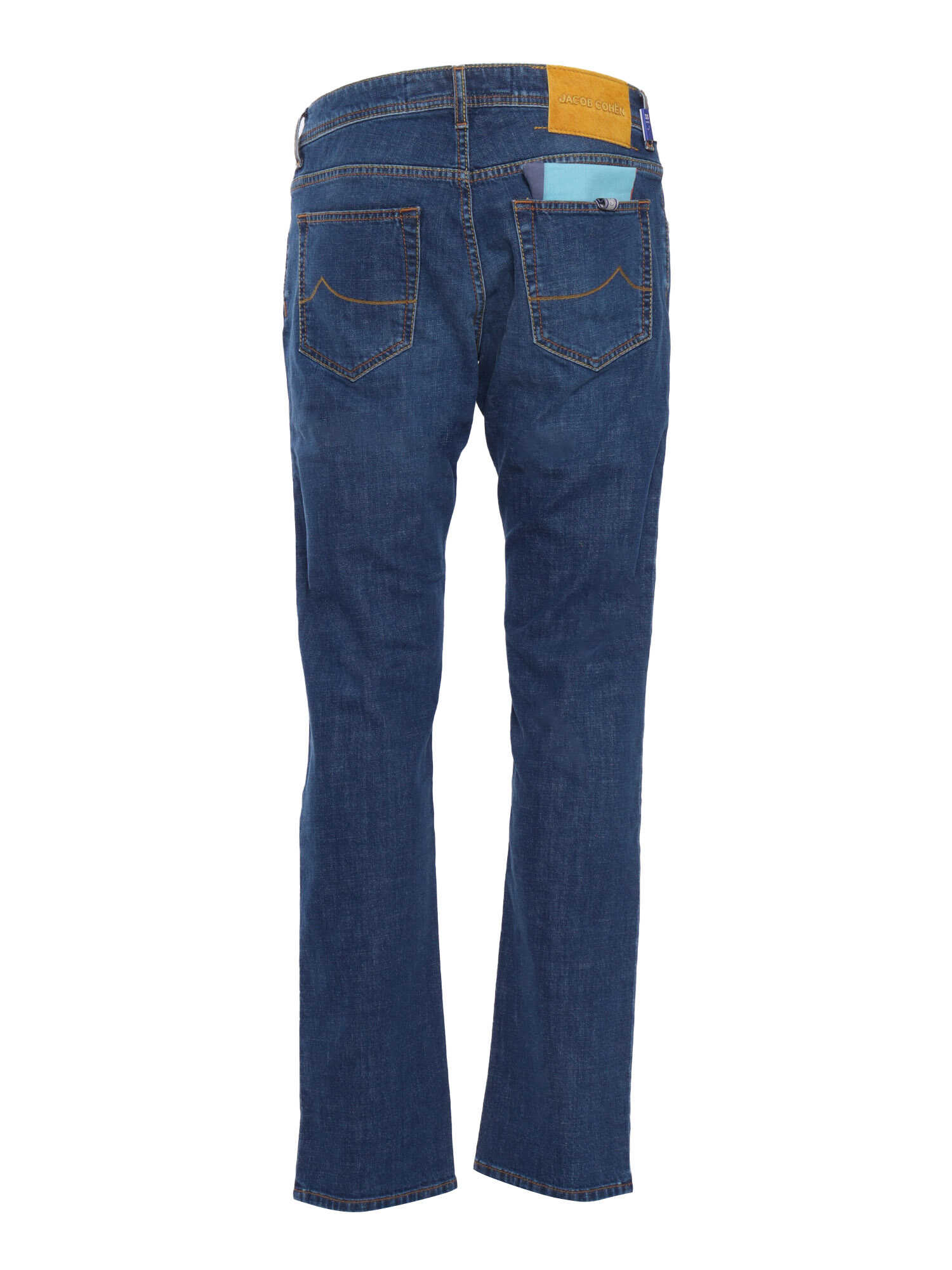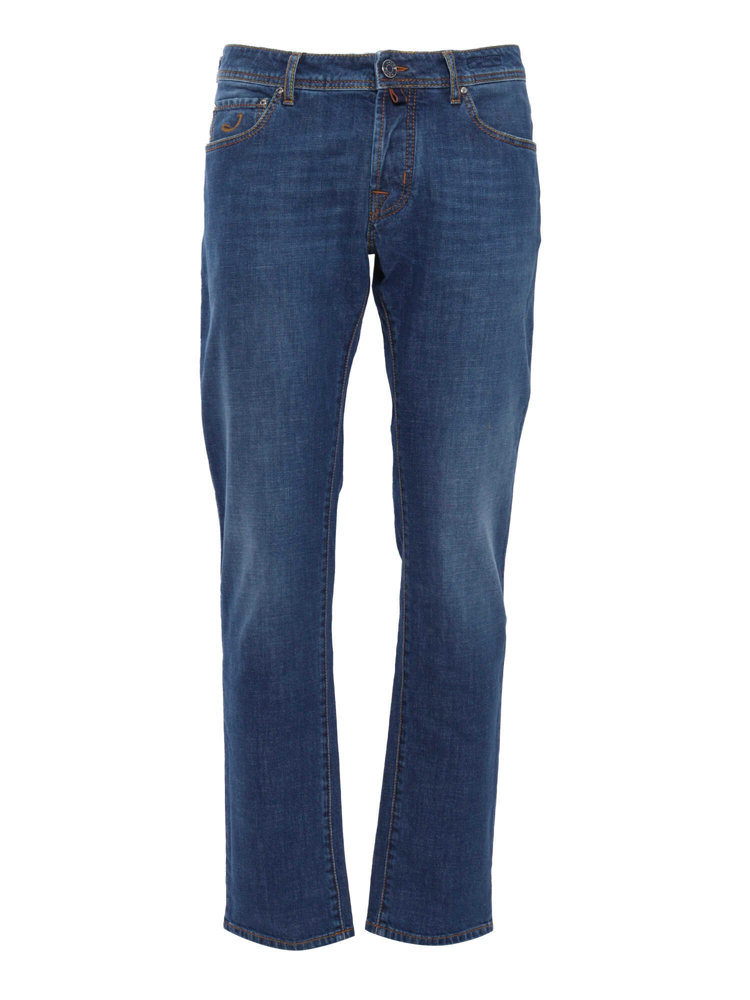 Stretch cotton blend jeans, 5 pockets, belt loops, logo, contrast stitching, stone washed, handkerchief supplied