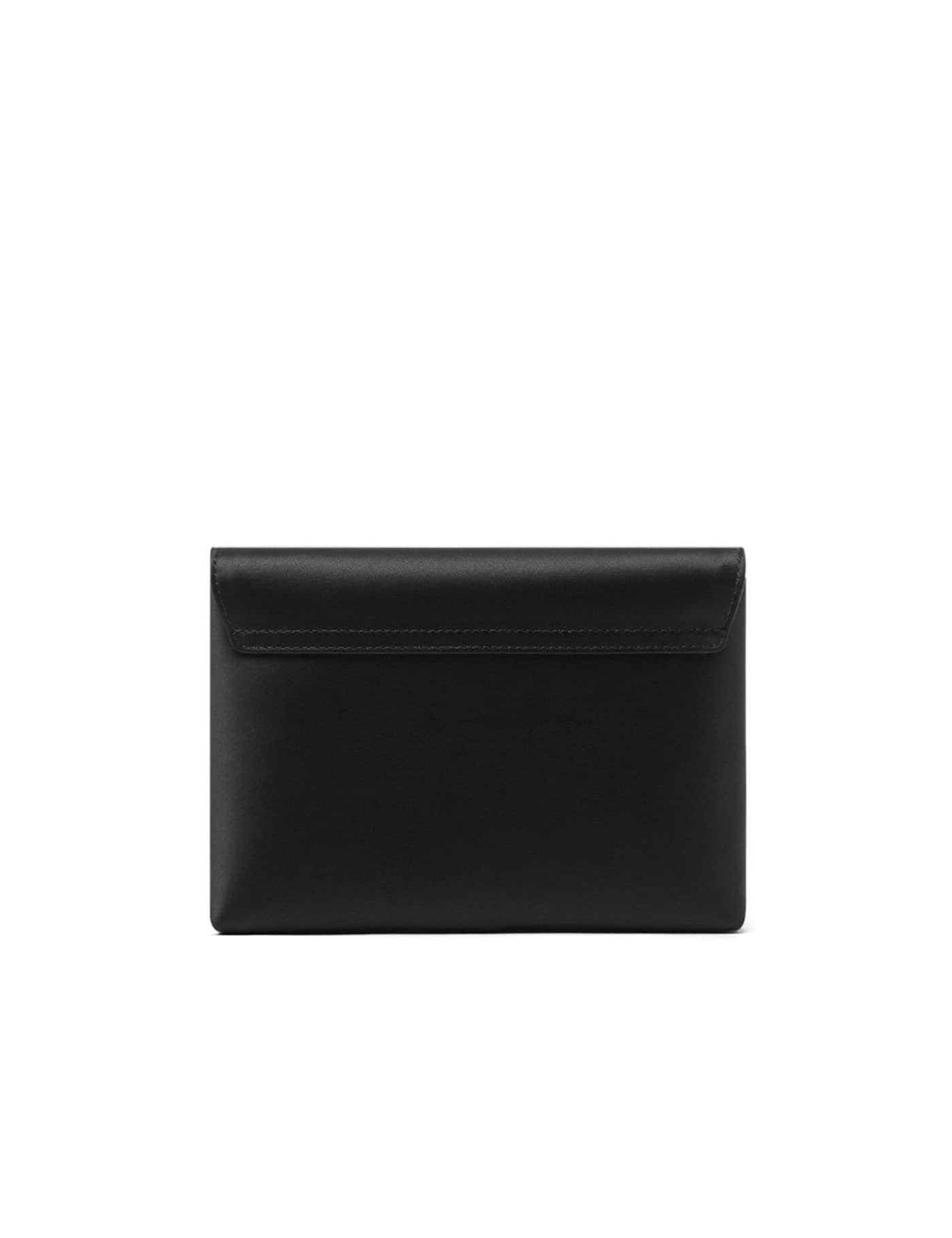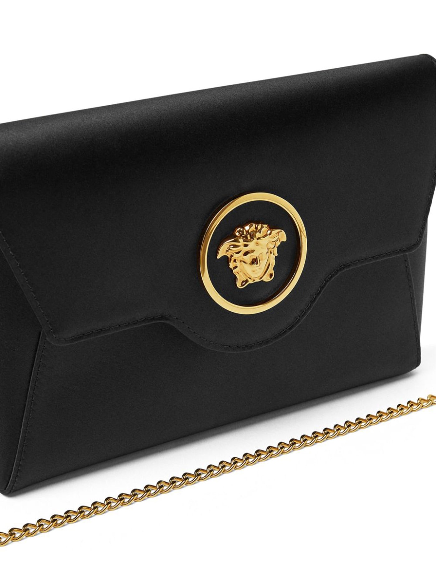 Black satin envelope clutch bag. Removable shoulder strap. Interior compartment with card pocket. Gold metal La Medusa logo on front. Flap closure with magnetic button. Width: 20 Height: 13 Depth: 2