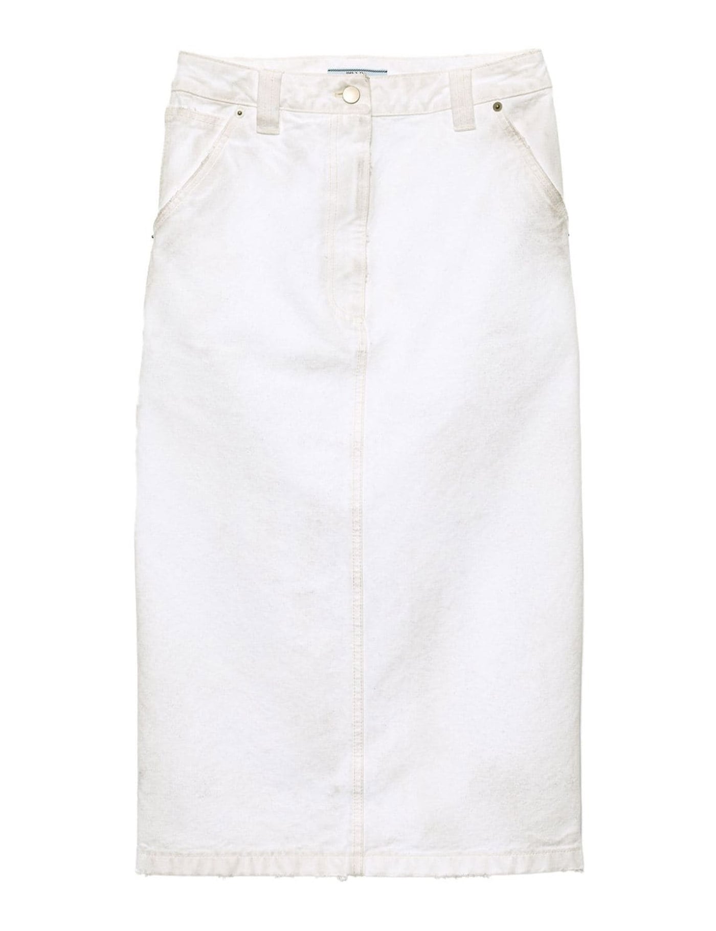 Cotton Denim Skirt by Prada featuring a midi style, five-pocket design, front button and zipper closure, waist belt loops, worker pocket at back, iconic triangular leather patch with signature brand pressure print applied at back, monochrome pattern, regularr fit.