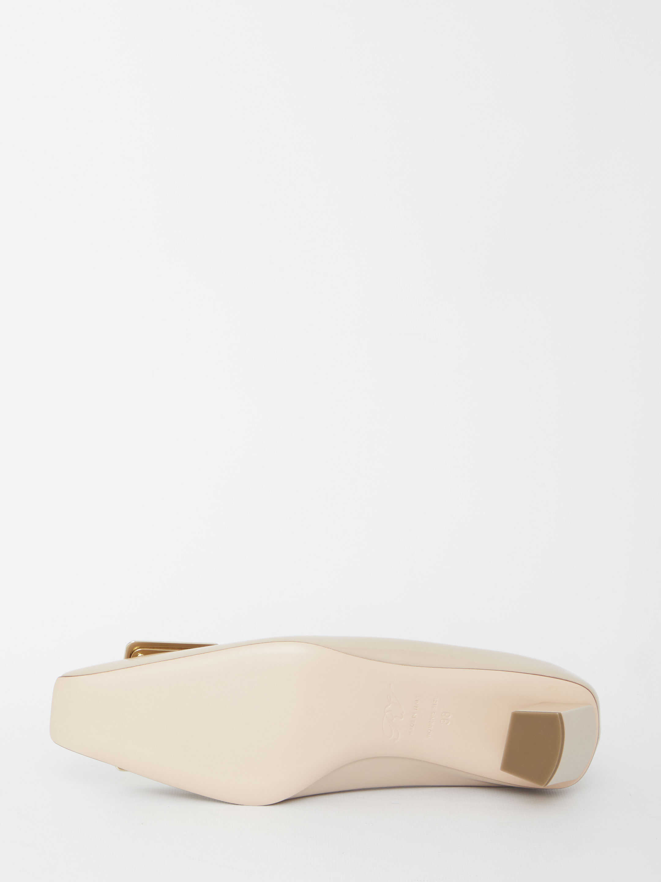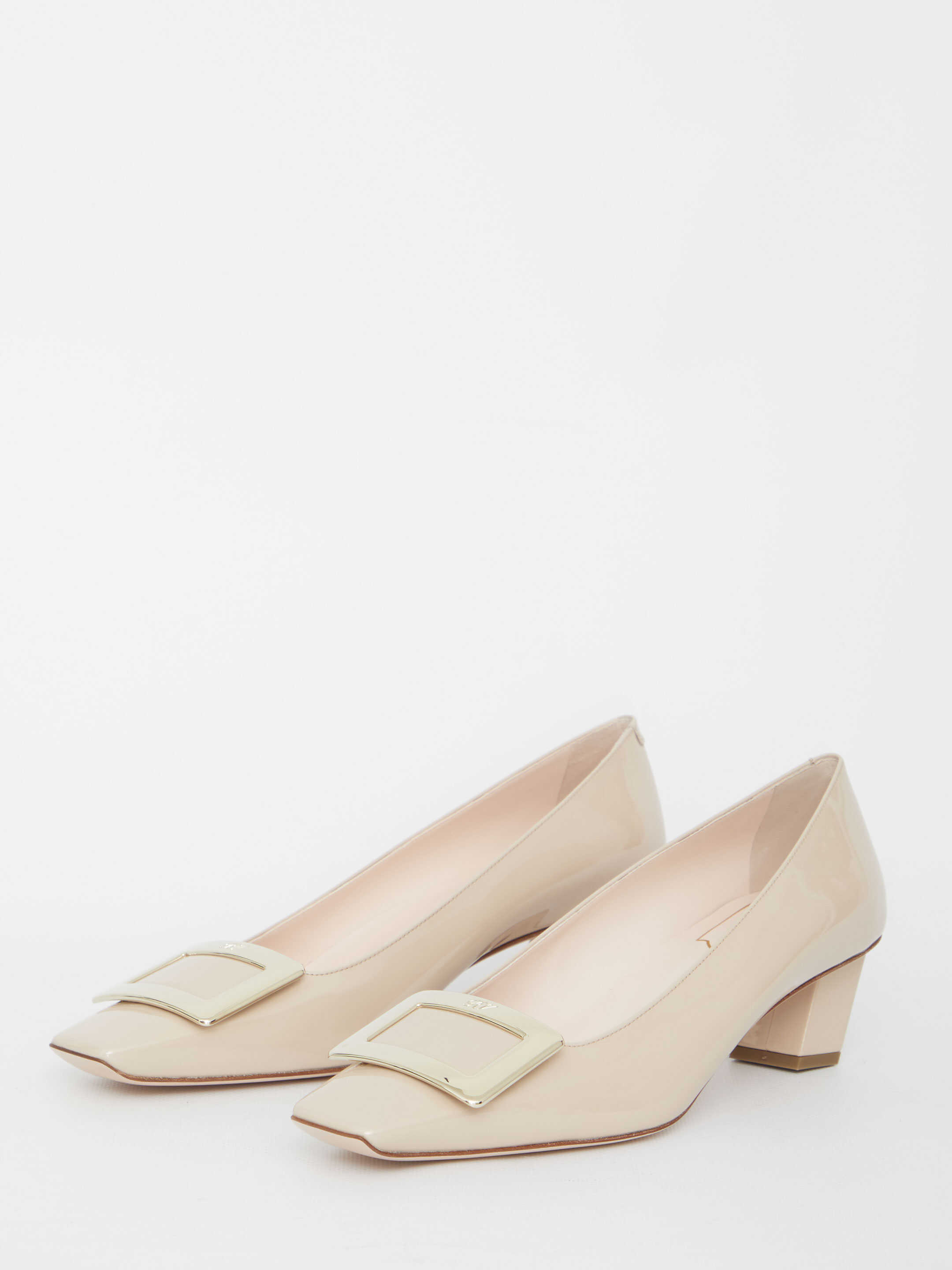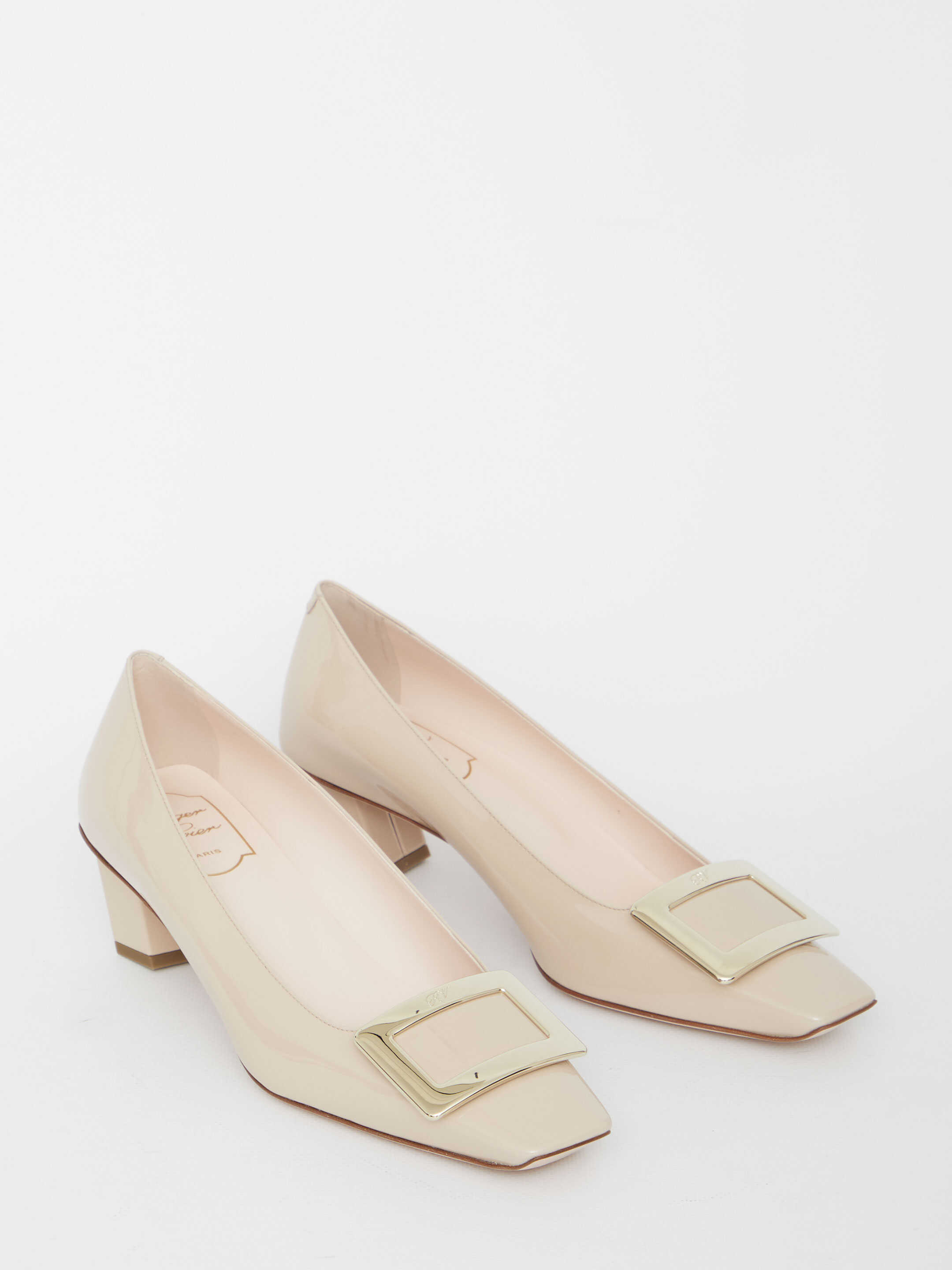 Belle Vivier pumps in powder pink patent leather with metal squared and logoed buckle. Square toe, embossed Roger Vivier logo on the insole and inclined square heel. Leather sole. Any leather imperfections are not to be considered manufacturing defects, but a peculiarity of the material.