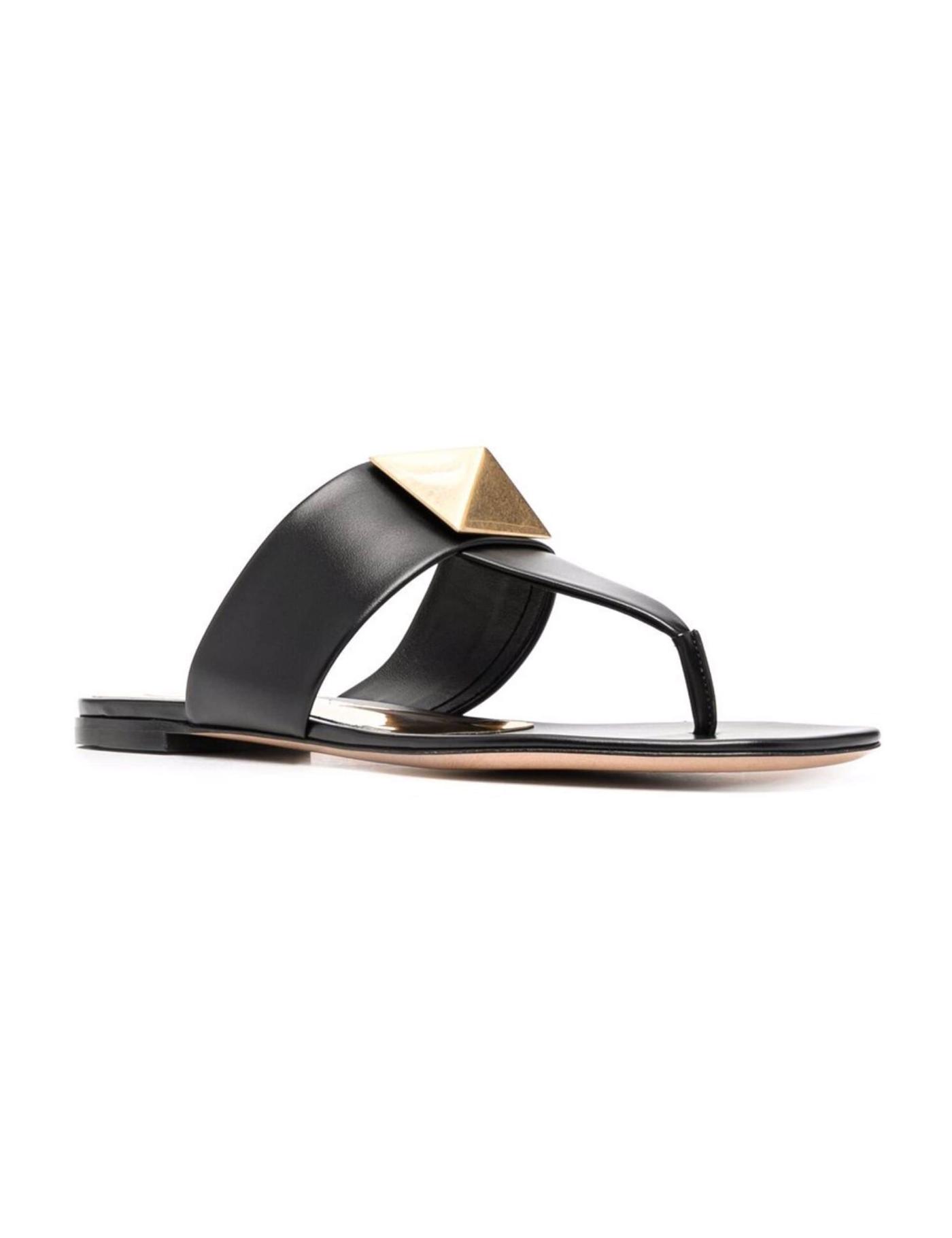 A larger version of the signature Rockstud detailing, the Roman Stud was launched by Valentino Garavani's in 2020. Here featured atop of these leather sandals, it contrasts the black background.
