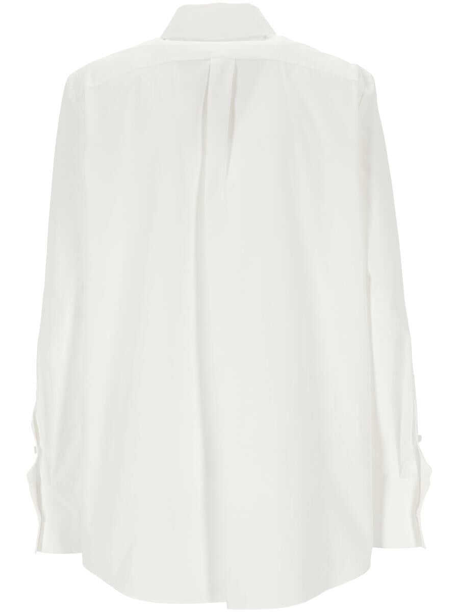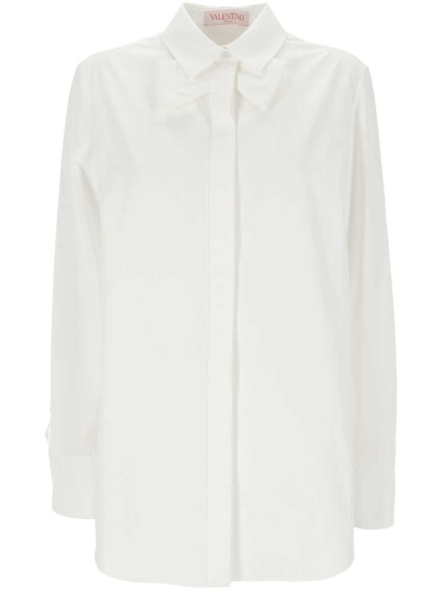 white cotton poplin texture bow detailing classic collar concealed front press-stud fastening long sleeves buttoned cuffs curved hem